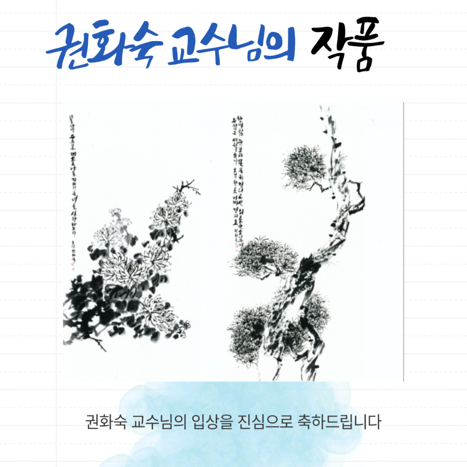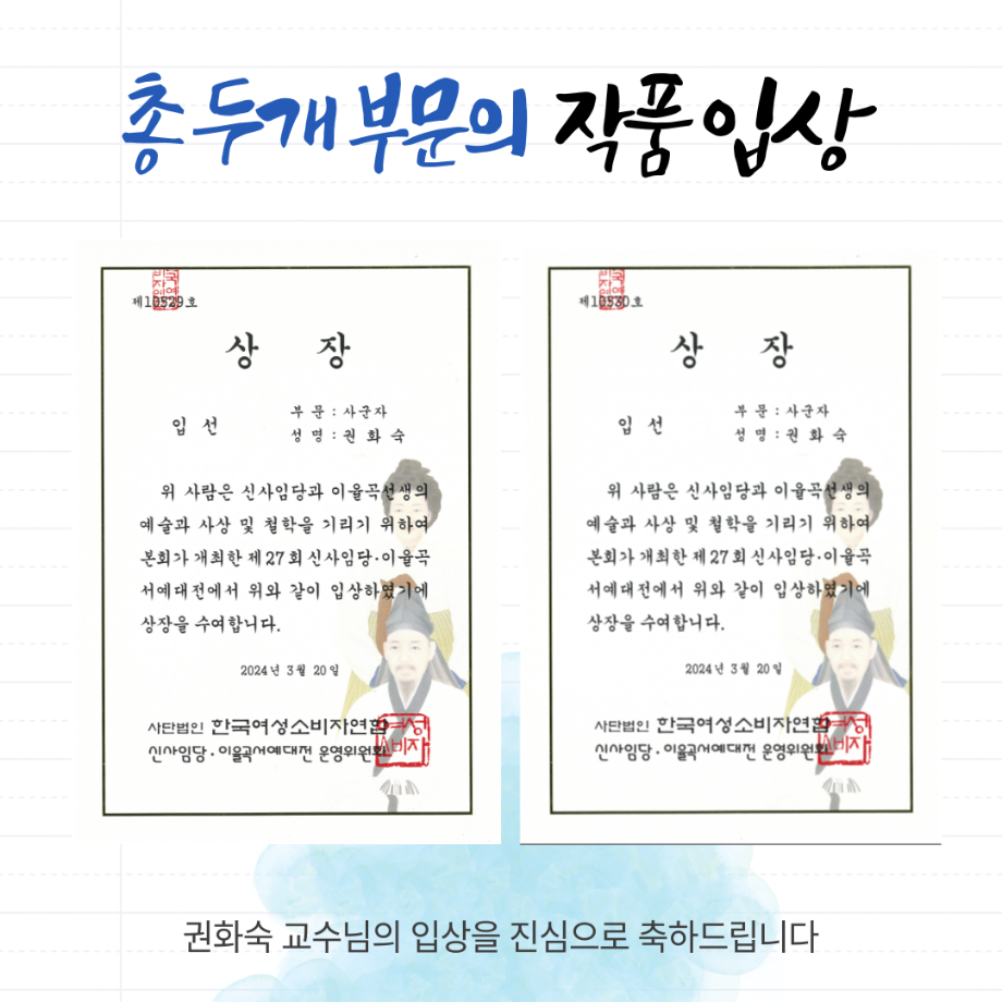 본문 시작 홈으로 MCC News 학과소개 교수소개 학과과정 MCC News MCC SNS 홈페이지가이드 교수 및 졸업생 학과 및 재학생 교수 및 졸업생 미디어 정보통 교수 및 졸업생 페이스북 트위터 프린트 🎊권화숙 교수님의 제27회 신사임당 이율곡 서예대전 입선🎊 디지털콘텐츠창작학과 2611 2024-08-19 디지털콘텐츠창작학과 권화숙 교수님께서제27회 신사임당 이율곡 서예대전에서 입상하셨습니다! 권화숙 교수님께서 지난 3월에 개최된 서예대전에서 입상하셨는데요, 총 두 개의 아름다운 솜씨가 돋보이는 작품으로 당당하게 입선하셨습니다! 진심으로 축하드립니다! 목록 이전권화숙 교수님의 5월 신간 소개 다음 권화숙 교수님의 동시집 '음식 말놀이'를 소개합니다! 담당부서 : 미디어콘텐츠창작학과 담당자 : - 연락처 : 043-649-1741 최종수정일 : 2024-10-26 만족도조사 만족도 조사 이 페이지에서 제공하는 정보에 대하여 만족하시나요? 매우만족 만족 보통 불만족 매우불만족