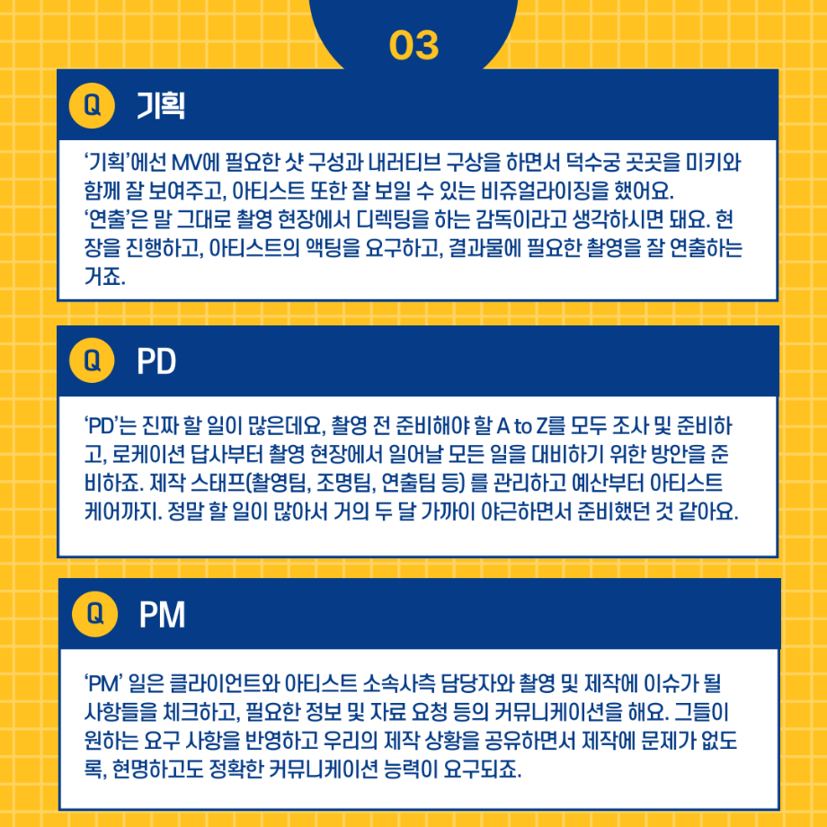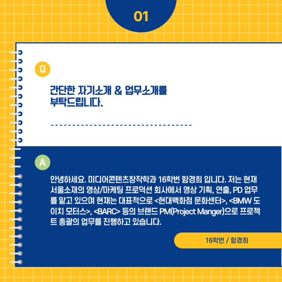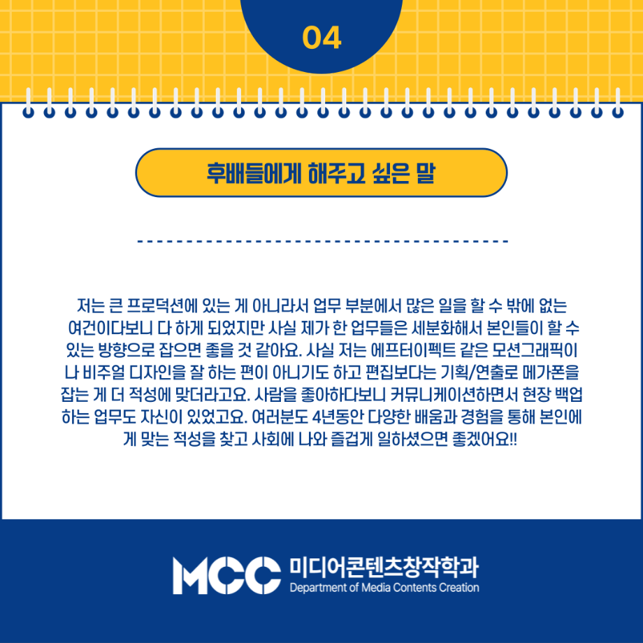 본문 시작 홈으로 MCC News 학과소개 교수소개 학과과정 MCC News MCC SNS 홈페이지가이드 교수 및 졸업생 학과 및 재학생 교수 및 졸업생 미디어 정보통 교수 및 졸업생 페이스북 트위터 프린트 🗣16학번 선배님의 현장 노하우🗣 미디어콘텐츠창작학과 3745 2024-10-24 오늘은 미디어콘텐츠창작학과를 졸업하신 16학번 함경희 선배님의 인터뷰를 진행했습니다 선배님이 현장에서 얻은 노하우와 소중한 경험들을 인터뷰를 통해 확인해보세요! 목록 이전권화숙 교수님의 동시집 '음식 말놀이'를 소개합니다! 다음 세명대 김기태 교수와 ㈜인포 박재원 대표, 10년째 장학금 기탁 담당부서 : 미디어콘텐츠창작학과 담당자 : - 연락처 : 043-649-1741 최종수정일 : 2024-10-26 만족도조사 만족도 조사 이 페이지에서 제공하는 정보에 대하여 만족하시나요? 매우만족 만족 보통 불만족 매우불만족
