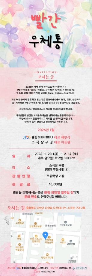 본문 시작 홈으로 MCC News 학과소개 교수소개 학과과정 MCC News MCC SNS 홈페이지가이드 교수 및 졸업생 학과 및 재학생 교수 및 졸업생 미디어 정보통 교수 및 졸업생 페이스북 트위터 프린트 권화숙 교수님 희곡 빨간우체통 공연 안내 미디어콘텐츠창작학과 1110 2026-01-16 권화숙 교수님께서 작성하신 희곡 작품 '빨간우체통'이 연극무대에 올려지게 되었습니다. 자세한 내용은 위 사진을 참고해주시면 됩니다. 목록 이전권화숙 교수님 향기로운 삶, 문인화 전시회 안내 다음 김기태 교수님, 처음책방 네 번째 기획전시 "시대의 거울, 우리잡지 창간호 100선" 담당부서 : 미디어콘텐츠창작학과 담당자 : - 연락처 : 043-649-1741 최종수정일 : 2024-10-26 만족도조사 만족도 조사 이 페이지에서 제공하는 정보에 대하여 만족하시나요? 매우만족 만족 보통 불만족 매우불만족