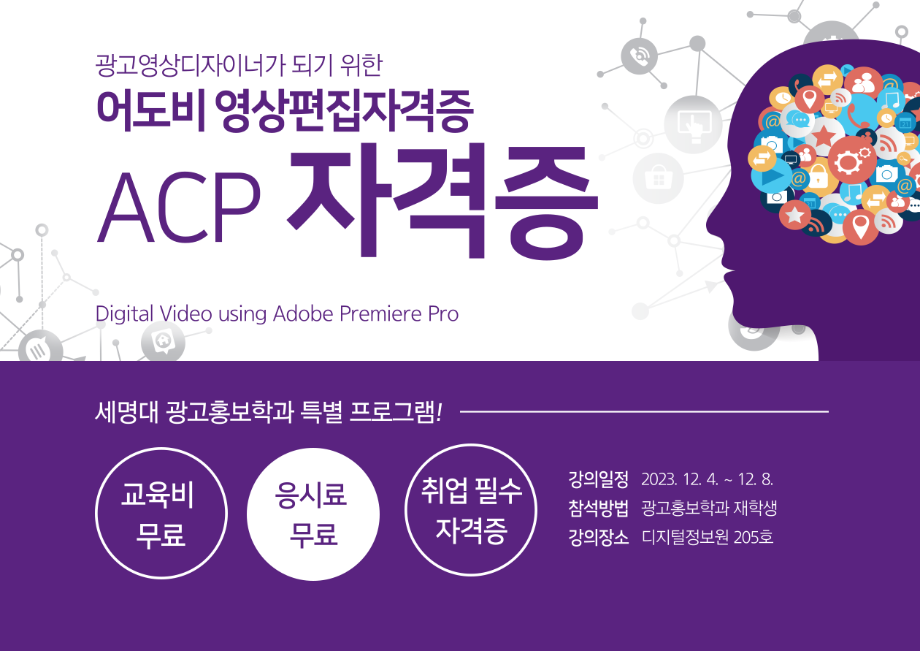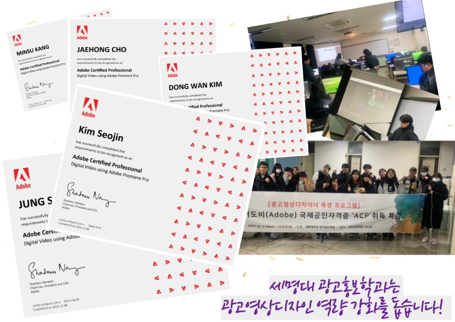본문 시작 홈으로 특별CC프로그램 매력적인 학과소개 흥미로운 교육과정 특별CC프로그램 We can 취업 따뜻한 커뮤니티 홈페이지가이드 광고디자인 자격증취득 광고영상 제작실습 광고디자인 자격증취득 C&E(도전!경험!) 광고디자인 자격증취득 페이스북 트위터 프린트 [경축]광고영상제작편집 자격증 전원 취득 광고홍보학과 1902 2024-01-04 광고홍보학과에서 지원하는 광고영상디자인 역량 강화 프로그램 어도비( Adobe) 국제 공인 자격증 ACP 전원 취득을 축하합니다! 목록 이전Adobe Premier Pro 자격증 취득 다음 Adobe 포토샵 자격증 전원 합격