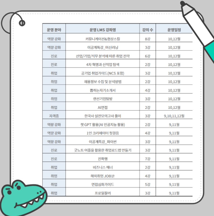 본문 시작 홈으로 We can 취업 매력적인 학과소개 흥미로운 교육과정 특별CC프로그램 We can 취업 따뜻한 커뮤니티 홈페이지가이드 취업지원프로그램 채용정보 취업지원프로그램 광고업계 회사소개 취업지원프로그램 페이스북 트위터 프린트 ★ [2025 대일플] 2025학년도 2학기 진로·취업 LMS 특강 안내 ★ 광고홍보학과 418 2025-09-05 대학일자리플러스센터 진로, 취업 지원 프로그램 목록 이전[디지털마케터취업교육생모집]한국디지털광고협회_취업연계교육 다음 ★위세광명포인트 5점★ 2025학년도 취업대비 영어인터뷰 교실 수강생 모집 안내