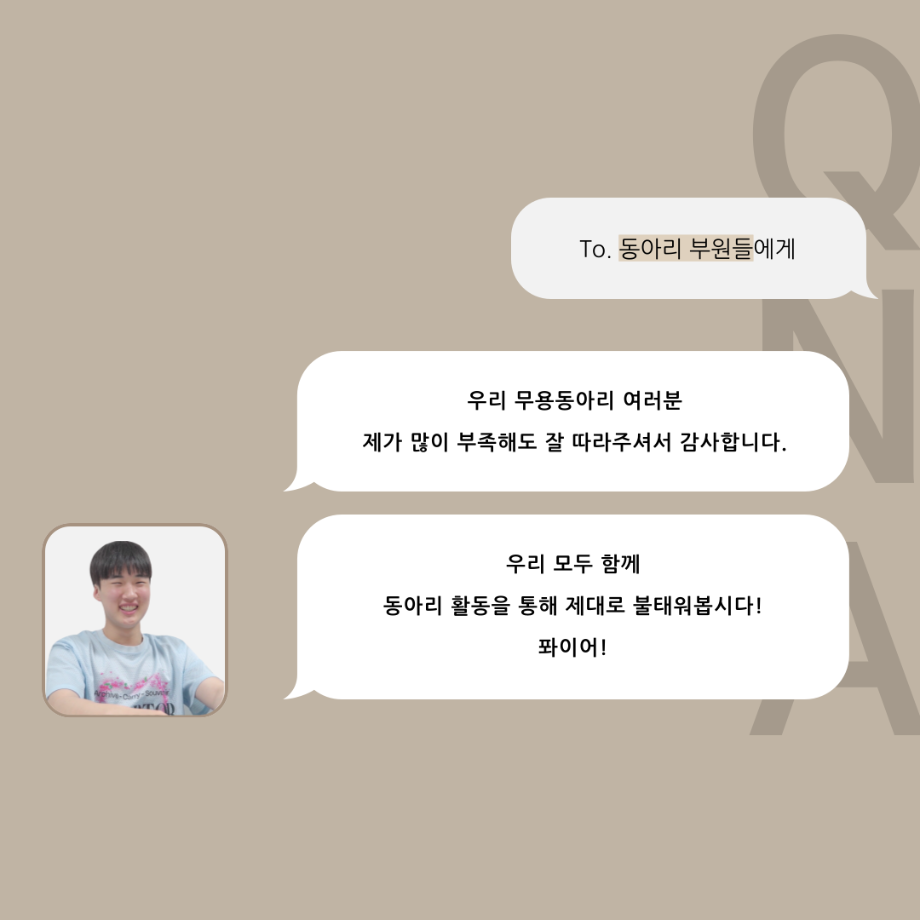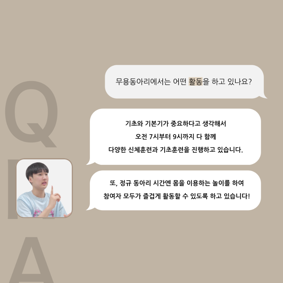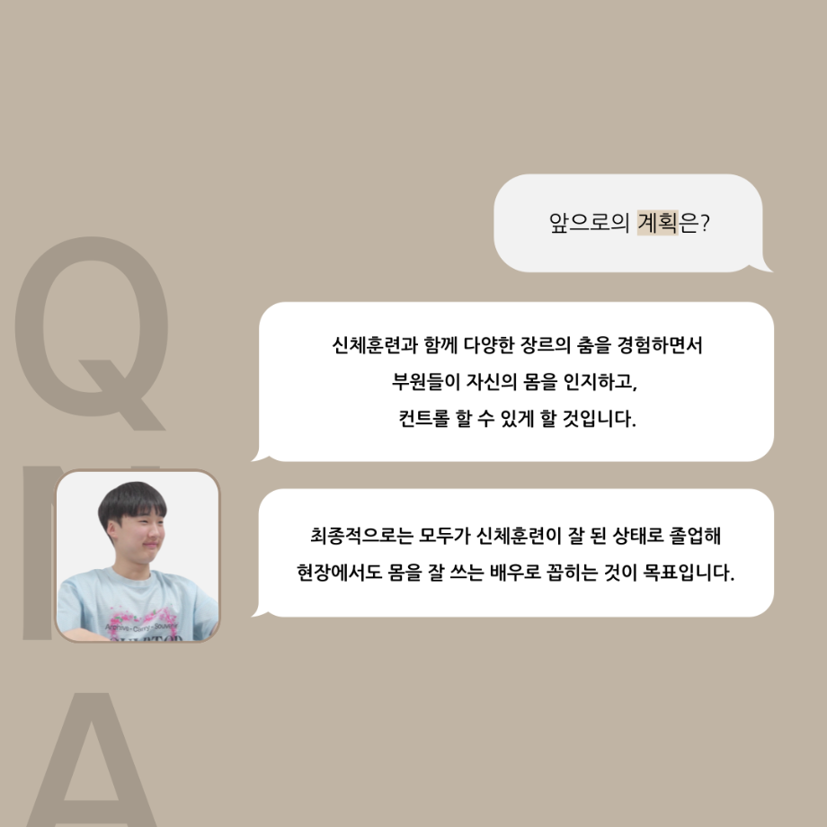 본문 시작 홈으로 커뮤니티 학과소개 입학정보 교수소개 학과과정 커뮤니티 공연예매 안내 홈페이지가이드 동아리 공지사항 포토갤러리 작품DB 동아리 학사일정 학생회 무용 동아리 무용 동아리 뮤지컬 동아리 극장 스탭 동아리 배우 훈련 동아리 무용 동아리 페이스북 트위터 프린트 '품'위있는 인'터뷰' - 24년도 무용동아리장 <윤샘> 연기예술학과 3481 2024-07-29 안녕하십니까. 24년도 학회 ‘품‘ 입니다. 학회 ‘품’의 일곱 번째 인터뷰로 세명대학교 연기예술학과 24학년도 무용동아리장인 윤샘 학우와 인터뷰 하는 시간을 가졌습니다. 무용 동아리장이 된 계기와 동아리에서는 어떤 활동을 하고있는지, 앞으로의 계획은 무엇으며 동아리 부원들에게 전하고 싶은 말 등을 질문하는 시간을 가졌습니다. 앞으로 있을 인터뷰 컨텐츠인 ‘품터뷰’ 많은 사랑 부탁드립니다. 목록 이전2024년도 1학기 무용동아리 - 화란 활동! 다음 2025년도 1학기 무용동아리 화란 만족도조사 만족도 조사 이 페이지에서 제공하는 정보에 대하여 만족하시나요? 매우만족 만족 보통 불만족 매우불만족