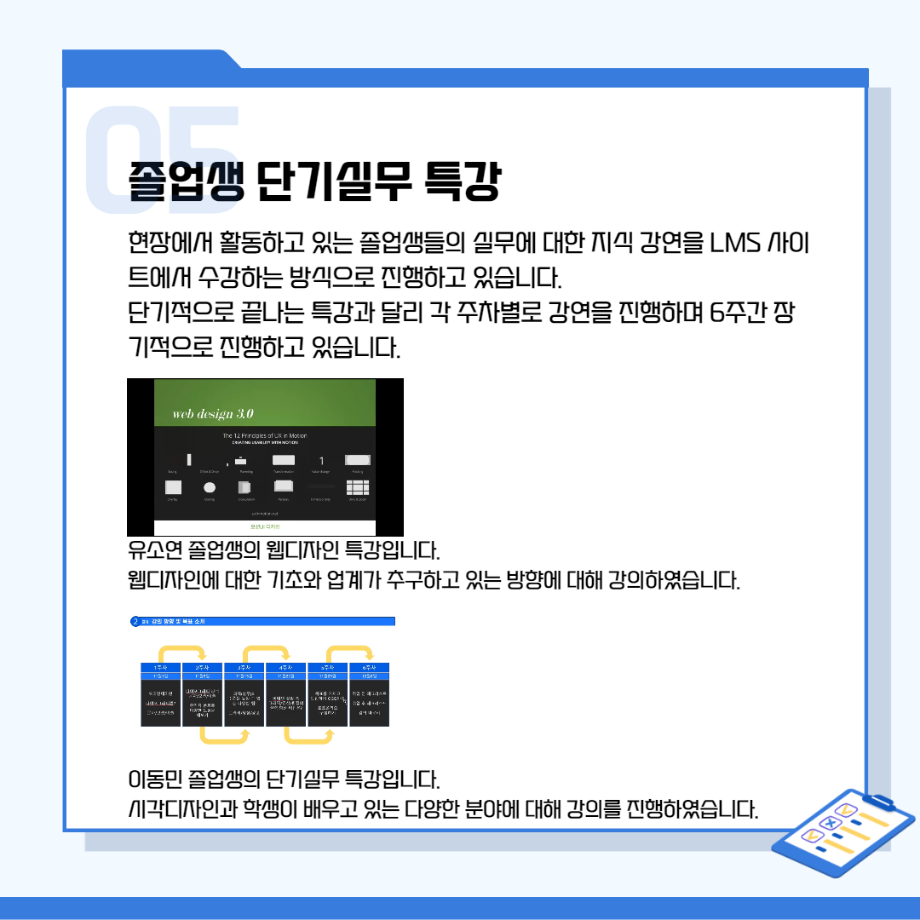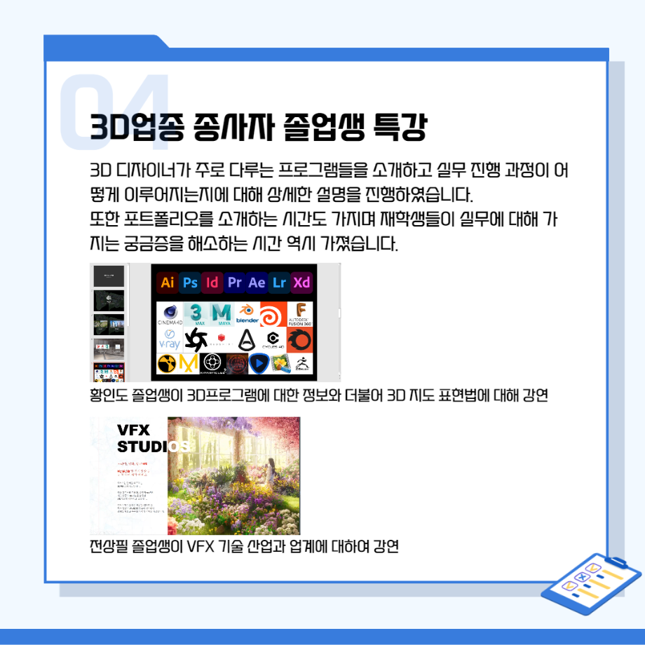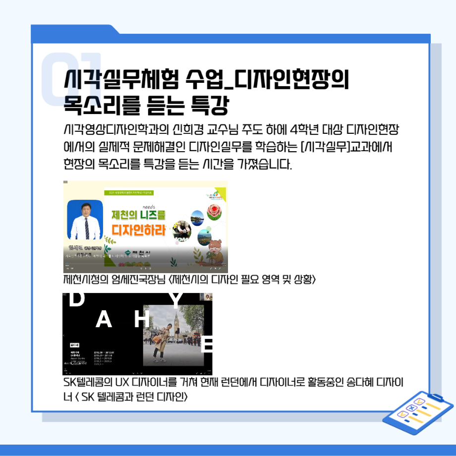 본문 시작 홈으로 시영소식 학과소개 학과과정 시영소식 입학/취업 AI 학과자랑 SNS소통 홈페이지가이드 학과행사 공지사항 학과행사 공모전 학생 인터뷰 학과행사 페이스북 트위터 프린트 시각영상디자인학과 특강 총정리! 시각영상디자인학과 2641 2022-02-07 목록 이전[대학혁신지원사업]단기실무 프로그램 다음 인문예술대학 특강 - 변화와 혁신의 시대! 열정과 디테일로 승부하라!!! 담당부서 : 시각영상디자인학과 담당자 : - 연락처 : 043-649-1726 최종수정일 : 2024-10-26 만족도조사 만족도 조사 이 페이지에서 제공하는 정보에 대하여 만족하시나요? 매우만족 만족 보통 불만족 매우불만족