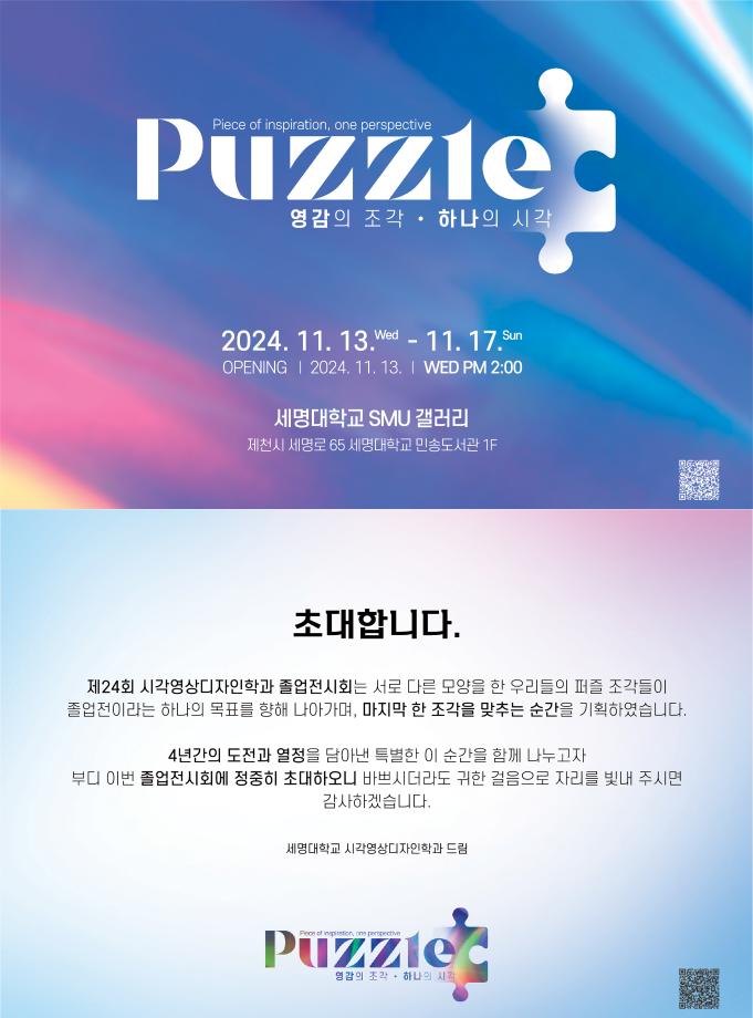 본문 시작 홈으로 시영소식 학과소개 학과과정 시영소식 입학/취업 AI 학과자랑 SNS소통 홈페이지가이드 학과행사 공지사항 학과행사 공모전 학생 인터뷰 학과행사 페이스북 트위터 프린트 2024 졸업전시회 오프닝 시각영상디자인학과 1969 2024-11-07 본교 캠퍼스에서 총장님을 모시고 11월 13일 오후2시에 본교 캠퍼스 smu갤러리에서 오프닝행사를 성대히 치렀습니다, 4학년 모두의 노고에 감사하고 다시 한번 졸전을 축하합니다 모바일 초대장 https://dodoring12.github.io/ 목록 이전2024 세명 콘텐츠 스쿨 콘텐츠 피칭 다음 햄버거데이 담당부서 : 시각영상디자인학과 담당자 : - 연락처 : 043-649-1726 최종수정일 : 2024-10-26 만족도조사 만족도 조사 이 페이지에서 제공하는 정보에 대하여 만족하시나요? 매우만족 만족 보통 불만족 매우불만족