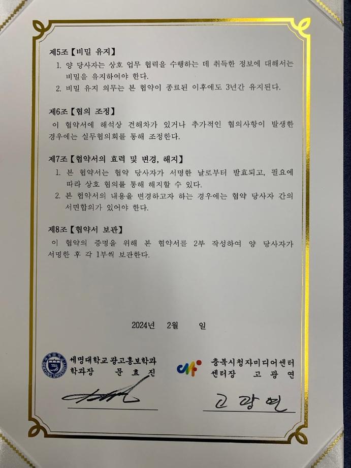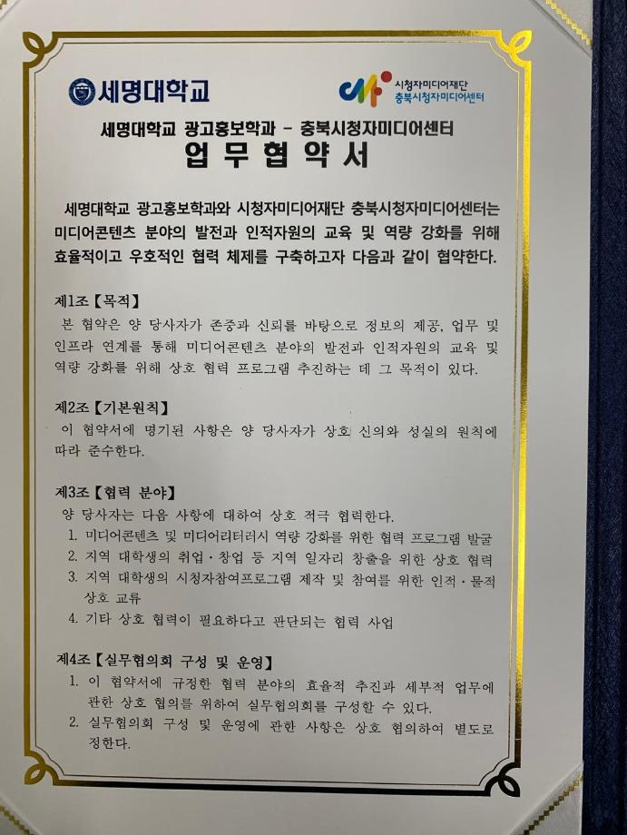 본문 시작 홈으로 매력적인 학과소개 매력적인 학과소개 흥미로운 교육과정 특별CC프로그램 We can 취업 따뜻한 커뮤니티 홈페이지가이드 지금 우리 광홍은 학과개요 학과연혁 교수소개 Wilco로 보는광고홍보학과 지금 우리 광홍은 지금 우리 광홍은 페이스북 트위터 프린트 [충북시청자미디어센터-세명대광고홍보학과] 업무협약 체결 광고홍보학과 3243 2024-07-17 <충북시청자미디어센터>와 <세명대 광고홍보학과> 업무협약식 개최 지역 미디어 콘텐츠 분야의 발전과 광고홍보 전문인력양성지원을 위해 큰 우군을 얻었습니다. ^^ '세명대 광고홍보학과'는 광고와 다양한 콘텐츠를 위한 [기획 맛집]을 넘어 [영상제작 맛집]을 향해 갑니다. 목록 이전[학과홍보]지금 우리 광홍은! 다음 [공동교육과정]단양/제천 소재 고교생 대상 광고/마케팅 특강