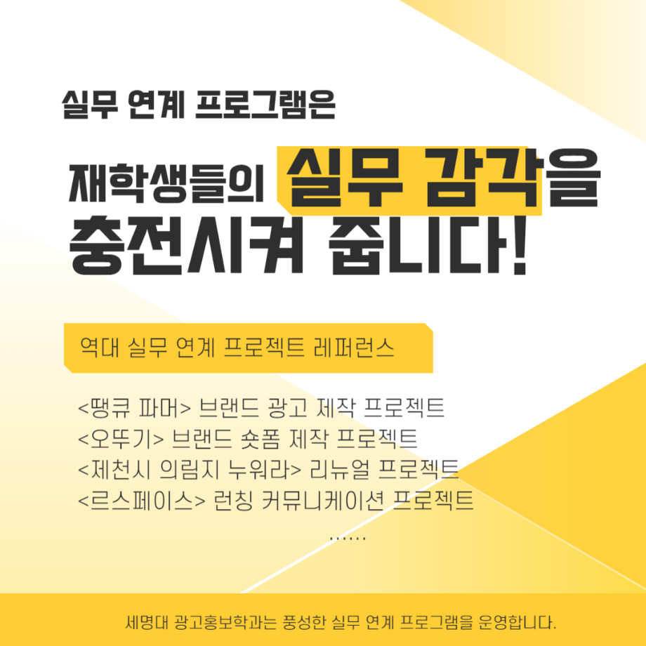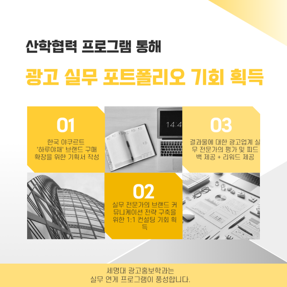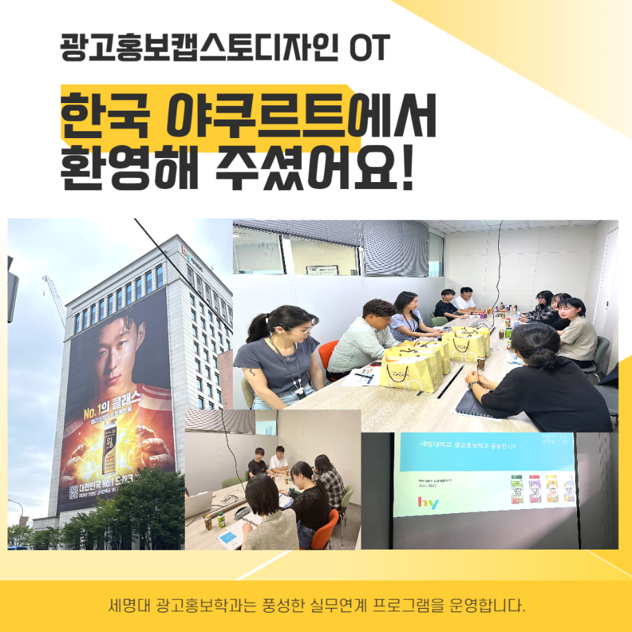 본문 시작 홈으로 매력적인 학과소개 매력적인 학과소개 흥미로운 교육과정 특별CC프로그램 We can 취업 따뜻한 커뮤니티 홈페이지가이드 지금 우리 광홍은 학과개요 학과연혁 교수소개 Wilco로 보는광고홍보학과 지금 우리 광홍은 지금 우리 광홍은 페이스북 트위터 프린트 [광고홍보캡스톤디자인]한국야쿠르트 <하루야채> 브랜드 광고홍보학과 3407 2024-09-10 2024년도 2학기 광고홍보캡스톤디자인 수업 _주 제 : 한국야쿠르트 <하루야채> 브랜드 구매 확장 전략 _담당교수 : 김신엽 교수님 _일 정 : 2024년도 2학기 성공적인 결과물을 기대합니다. : ) 세명대 광고홍보학과는 기획 맛집을 지향합니다~. 목록 이전[공동교육과정]단양/제천 소재 고교생 대상 광고/마케팅 특강 다음 [수상]2024코삭챌린저상