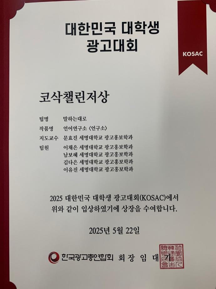 본문 시작 홈으로 매력적인 학과소개 매력적인 학과소개 흥미로운 교육과정 특별CC프로그램 We can 취업 따뜻한 커뮤니티 홈페이지가이드 지금 우리 광홍은 학과개요 학과연혁 교수소개 Wilco로 보는광고홍보학과 지금 우리 광홍은 지금 우리 광홍은 페이스북 트위터 프린트 2025KOSAC_트로피_상장 광고홍보학과 1216 2025-08-01 <2025년 대한민국 대학생 광고대회>에서 좋은 성적을 거둔 우리 학생들 축하해요. ^^ 금상 트로피가 학과에 왔네요. 그리고 챌린저상 수상 소식도 계속 들려오고 있네요. 모든 학생들의 열정과 노력에 감사합니다. : ) *크리에이티브 기획맛집 세명대 광고홍보학과! 목록 이전[경축]2025 KOSAC 전국대회 금상 다음 2025 Creative Challenge 공모전