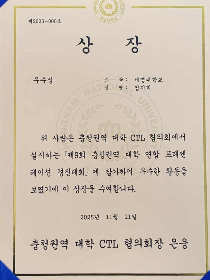 본문 시작 홈으로 매력적인 학과소개 매력적인 학과소개 흥미로운 교육과정 특별CC프로그램 We can 취업 따뜻한 커뮤니티 홈페이지가이드 지금 우리 광홍은 학과개요 학과연혁 교수소개 Wilco로 보는광고홍보학과 지금 우리 광홍은 지금 우리 광홍은 페이스북 트위터 프린트 25학번 엄지희_충청권역 대학 연합 프레젠테이션_우수상 광고홍보학과 1008 2025-11-24 우리 광고홍보학과 25학번 엄지희 학생이 '제9회 충청권역 대학 연합 프레젠테이션 경진대회'에서 우수상을 수상했어요. ^^ 훌륭하고, 대견합니다. 진심으로 축하합니다. '기획 맛집' 세명대 광고홍보학과!!! '발표 맛집' 까지... 목록 이전2025-2학기 개강총회 다음 새해 복 많이 받으세요 : )