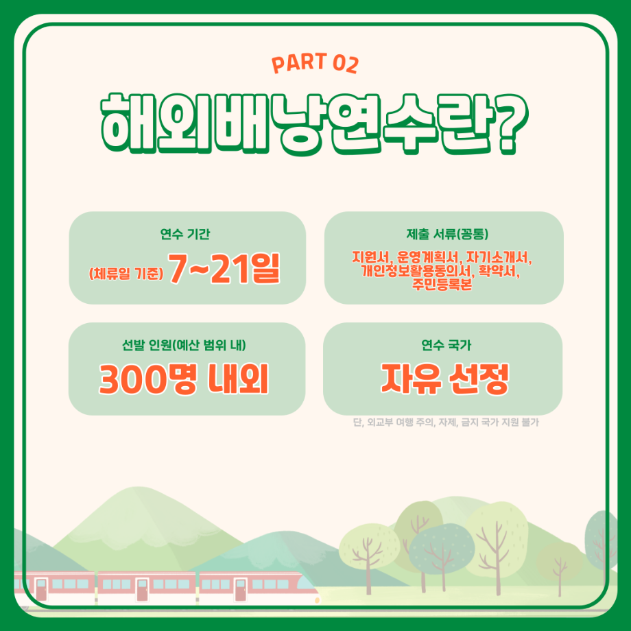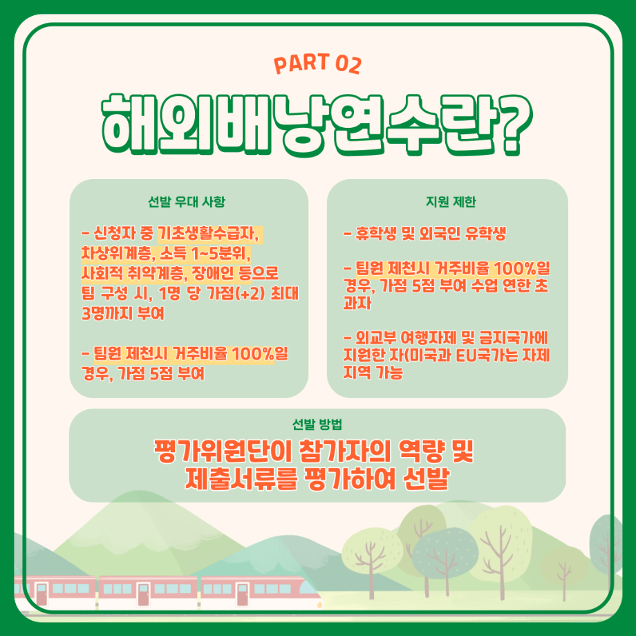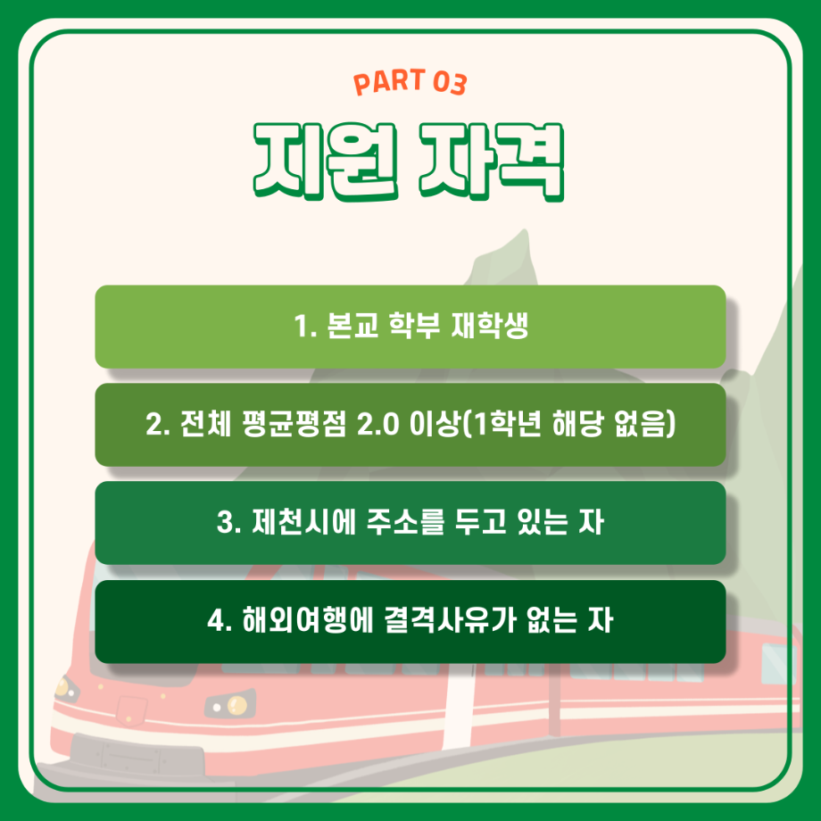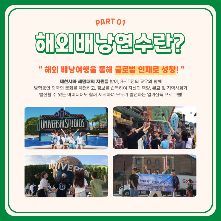 본문 시작 홈으로 학부활동 학부소개 학부활동 교육과정 커뮤니티 학부생활 입학안내 홈페이지가이드 학부행사 학부행사 학생회 활동 전공 동아리 학부갤러리 학부행사 페이스북 트위터 프린트 세명대학교 해외배낭연수 안내 컴퓨터학부 2734 2023-11-17 세명대학교 해외배낭연수 제천시와 세명대의 지원을 받아 3~10명의 교우와 함께 방학동안 외국의 문화를 체험하고, 정보를 습득하여 자신의 역량, 본교 및 지역사회가 발전할 수 있는 아이디어도 함께 제시하여 모두가 발전하는 일거삼득 프로그램, 해외배낭연수! 본교 학부 재학생이며, 제천시에 주소를 두고 있는 이들을 대상으로 진행 되는 프로그램이며 선발우대사항, 지원 제한, 선발 방법 등 보다 자세한 내용은 세명대학교 포털 공지사항에서 확인해주세요. 목록 이전🌾세명대학교 컴퓨터학부 단체봉사활동🌾 다음 재학생을 위한 과일나눔 이벤트 6차 '비타민DAY' 시행 안내 만족도조사 만족도 조사 이 페이지에서 제공하는 정보에 대하여 만족하시나요? 매우만족 만족 보통 불만족 매우불만족
