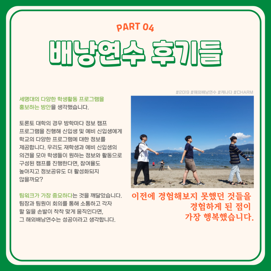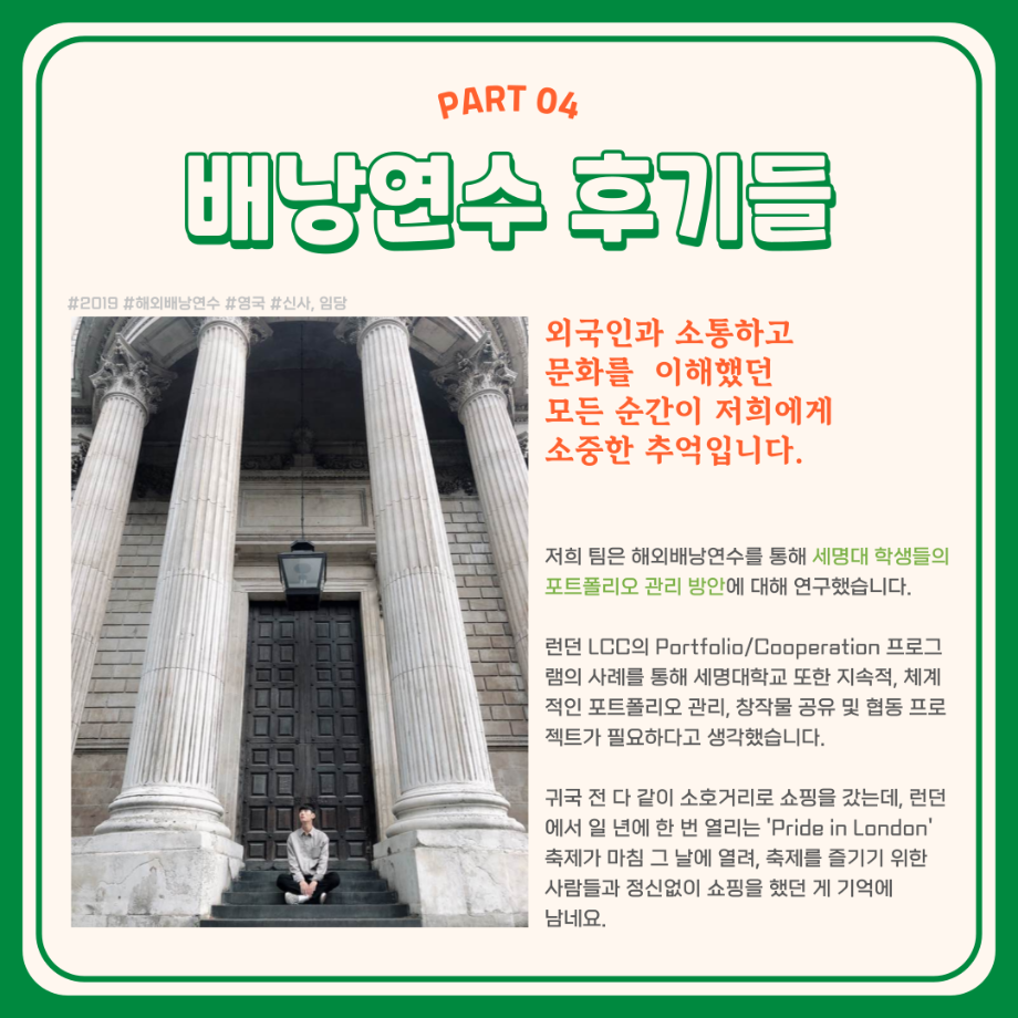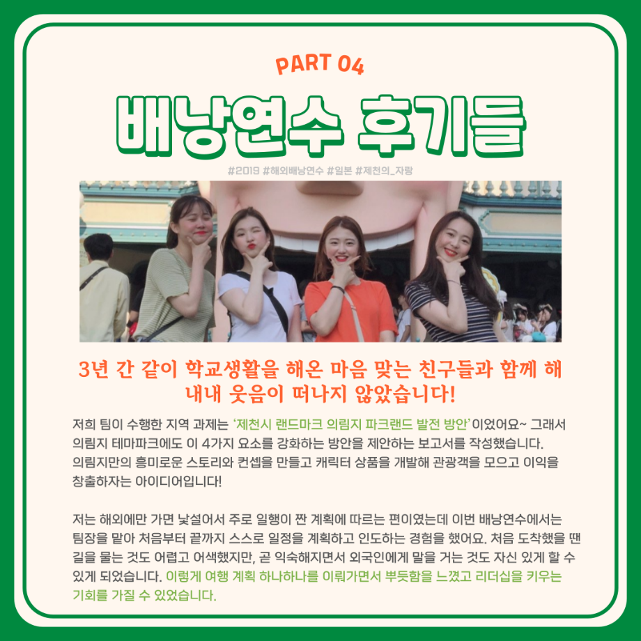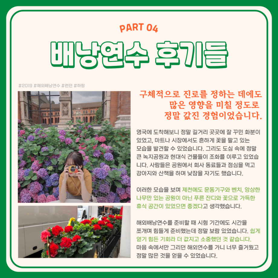 본문 시작 홈으로 학부활동 학부소개 학부활동 교육과정 커뮤니티 학부생활 입학안내 홈페이지가이드 학부행사 학부행사 학생회 활동 전공 동아리 학부갤러리 학부행사 페이스북 트위터 프린트 세명대학교 해외배낭연수 안내 컴퓨터학부 2734 2023-11-17 세명대학교 해외배낭연수 제천시와 세명대의 지원을 받아 3~10명의 교우와 함께 방학동안 외국의 문화를 체험하고, 정보를 습득하여 자신의 역량, 본교 및 지역사회가 발전할 수 있는 아이디어도 함께 제시하여 모두가 발전하는 일거삼득 프로그램, 해외배낭연수! 본교 학부 재학생이며, 제천시에 주소를 두고 있는 이들을 대상으로 진행 되는 프로그램이며 선발우대사항, 지원 제한, 선발 방법 등 보다 자세한 내용은 세명대학교 포털 공지사항에서 확인해주세요. 목록 이전🌾세명대학교 컴퓨터학부 단체봉사활동🌾 다음 재학생을 위한 과일나눔 이벤트 6차 '비타민DAY' 시행 안내 만족도조사 만족도 조사 이 페이지에서 제공하는 정보에 대하여 만족하시나요? 매우만족 만족 보통 불만족 매우불만족