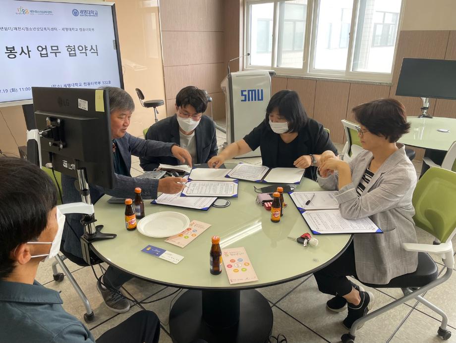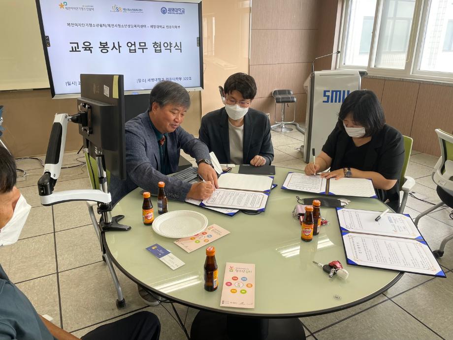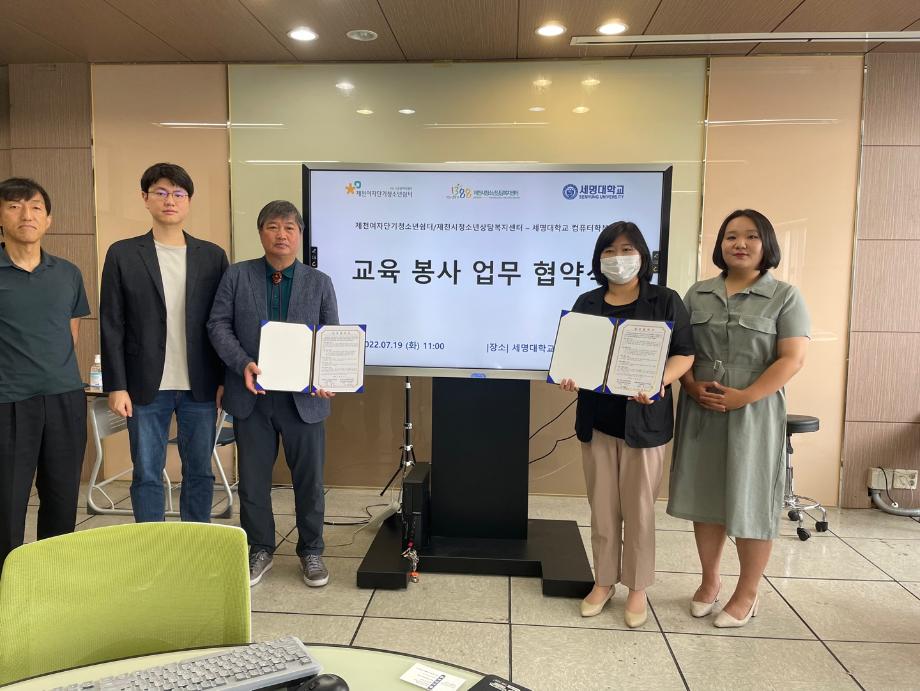 본문 시작 홈으로 학부활동 학부소개 학부활동 교육과정 커뮤니티 학부생활 입학안내 홈페이지가이드 학부행사 학부행사 학생회 활동 전공 동아리 학부갤러리 학부행사 페이스북 트위터 프린트 제천여자단기청소년쉼터/제천시청소년상담복지센터 - 세명대학교 컴퓨터학부 교육봉사 협약식 컴퓨터학부 2003 2022-07-28 우리 컴퓨터학부는 올해 제천시에 있는 제천여자단기청소년쉼터와 제천시청소년상담복지센터 이렇게 두개의 기관과 교육봉사 업무 협약을 진행하였습니다. 이번 협약은 기관 상호 간 협력체계를 구축하고 학교 밖 청소년·가정 밖 청소년 등 위기 청소년들에 대한 교육·복지 서비스를 제공해 청소년들이 진로·자기개발을 통해 건강한 삶을 영위할 수 있도록 도우려합니다. 일시: 2022년 7월 19일(화) 11:00시 장소: 첨단정보학관 322호 목록 이전2022 일반고 꿈더하기 수업량 유연화 프로젝트 다음 2022 제천미래교육지구 대학연계 진로체험 인턴십 프로그램 진행 만족도조사 만족도 조사 이 페이지에서 제공하는 정보에 대하여 만족하시나요? 매우만족 만족 보통 불만족 매우불만족