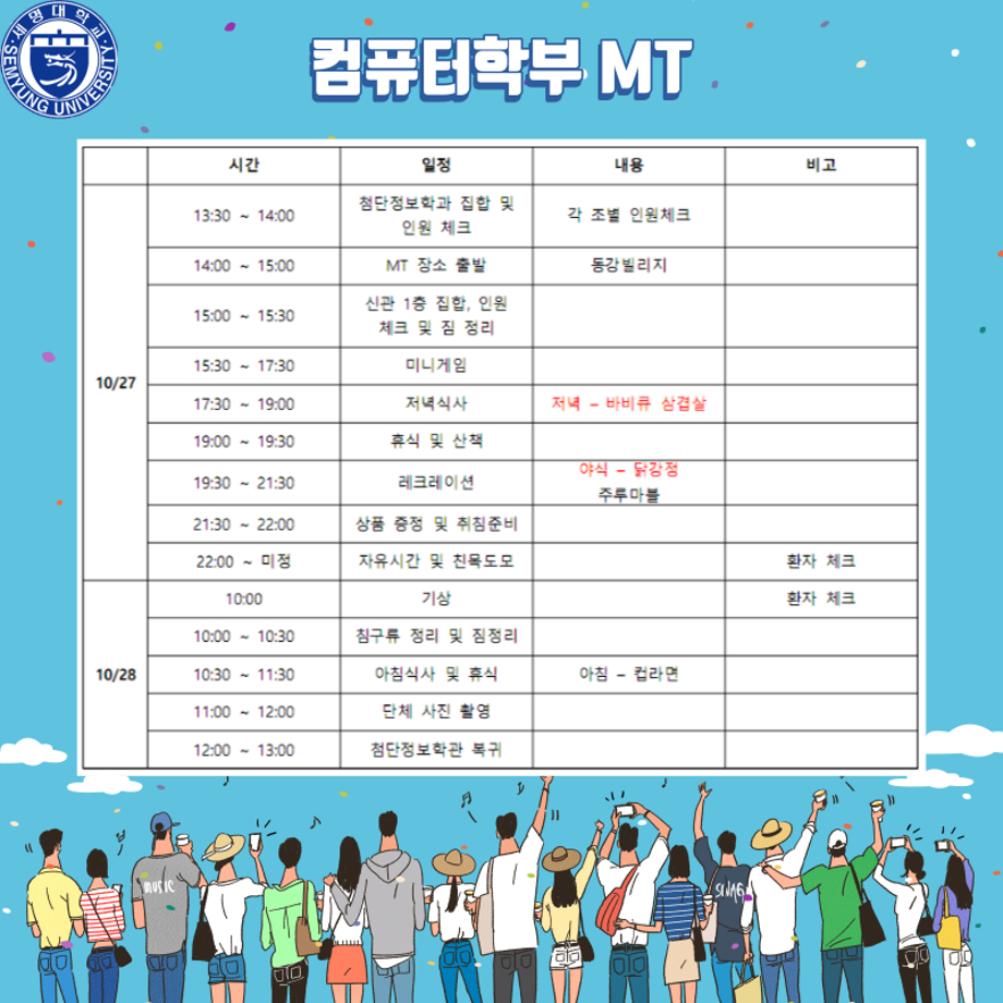 세명대학교 컴퓨터학부에서 진행하는 MT는 10월 27일에서 28일까지 강원도 영월군 동강 빌리지 펜션에서 이루어집니다.