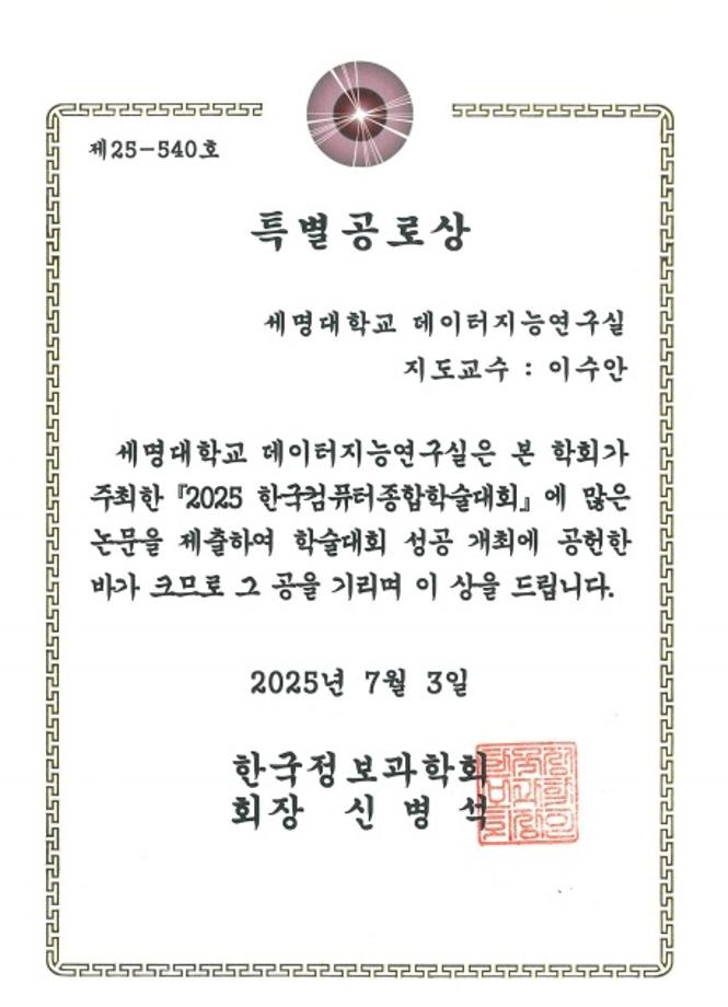 본문 시작 홈으로 학부활동 학부소개 학부활동 교육과정 커뮤니티 학부생활 입학안내 홈페이지가이드 학부행사 학부행사 학생회 활동 전공 동아리 학부갤러리 학부행사 페이스북 트위터 프린트 - KCC2025 세명대학교 데이터지능연구실 (이수안 교수) 특별공로상 수상 컴퓨터학부 780 2025-07-18 2025 한국컴퓨터종합학술대회(KCC2025)에서 세명대학교 데이터지능연구실(이수안 교수)이 특별공로상을 수상하였습니다. 축하드립니다. 목록 이전2025 한국컴퓨터종합학술대회 논문 발표 참가 - 2 다음 컴퓨터학부 최윤성 학생 공정위, 프랜차이즈 데이터 활용 공모전 우수상 수상 만족도조사 만족도 조사 이 페이지에서 제공하는 정보에 대하여 만족하시나요? 매우만족 만족 보통 불만족 매우불만족