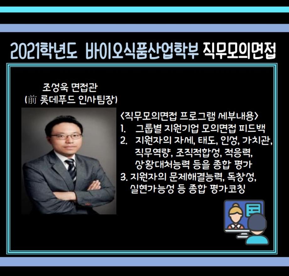 본문 시작 홈으로 학부소개 학부소개 진로·취업 교육과정 커뮤니티 대학원 입학상담 홈페이지가이드 갤러리 학부비전 학부장 인사말 학부연혁 학부장점 교수소개 교육시설 MOU 체결 갤러리 갤러리 페이스북 트위터 프린트 2021 직무모의면접 바이오식품영양학부 2370 2022-01-24 2021 직무모의면접 목록 이전2021 메디푸드개발 랜선조리경연대회 다음 2022 새내기 두드림 행사 만족도조사 만족도 조사 이 페이지에서 제공하는 정보에 대하여 만족하시나요? 매우만족 만족 보통 불만족 매우불만족