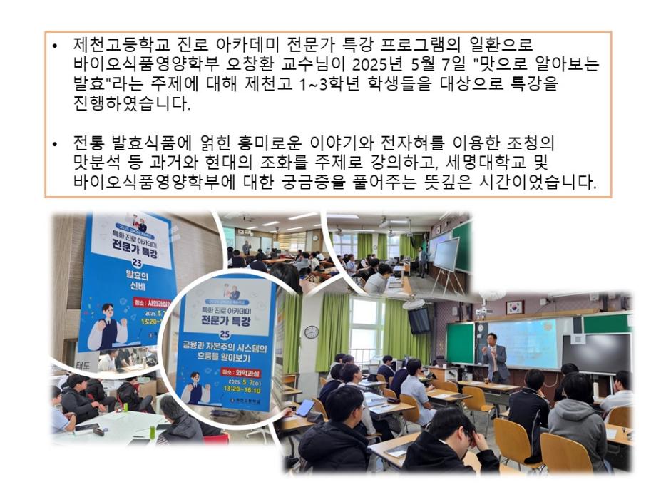 본문 시작 홈으로 학부소개 학부소개 진로·취업 교육과정 커뮤니티 대학원 입학상담 홈페이지가이드 갤러리 학부비전 학부장 인사말 학부연혁 학부장점 교수소개 교육시설 MOU 체결 갤러리 갤러리 페이스북 트위터 프린트 20250507 제천고 진로아카데미전문가특강(오창환교수님) 바이오식품영양학부 537 2025-06-10 목록 다음 2025년 1학기 바이오캡스톤디자인 다음 2025학년도 학부역량강화사업 "식품산업기사(작업형) 교육" 만족도조사 만족도 조사 이 페이지에서 제공하는 정보에 대하여 만족하시나요? 매우만족 만족 보통 불만족 매우불만족