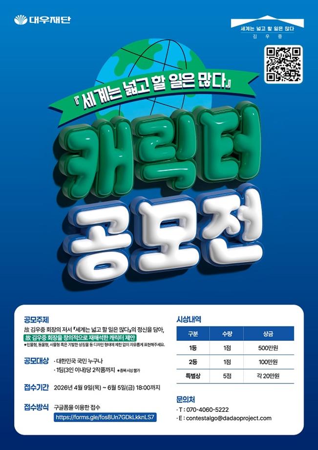대우재단에서는 故 김우중 회장을 모티프로 한「『세계는 넓고 할 일은 많다』 캐릭터 공모전」을 개최하고자 합니다.
