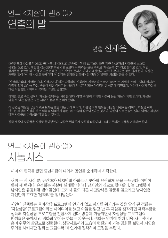 본문 시작 홈으로 학과과정 학과소개 입학정보 교수소개 학과과정 커뮤니티 공연예매 안내 홈페이지가이드 비교과프로그램 교육과정 전공교육 체계도 비교과프로그램 MOU 체결 하계, 동계 프로젝트 하계, 동계 프로젝트 연극놀이 지도사 양성 교육 현장실습 프로그램 액팅플러스 하계, 동계 프로젝트 페이스북 트위터 프린트 2021학년도 동계 프로젝트 ‘자살에 관하여’ 연기예술학과 2478 2021-03-26 목록 다음 2021학년도 동계 프로젝트 ‘넥스트 투 노멀’ 다음 2021학년도 동계 프로젝트 ‘오아시스 세탁소 습격사건’ 만족도조사 만족도 조사 이 페이지에서 제공하는 정보에 대하여 만족하시나요? 매우만족 만족 보통 불만족 매우불만족