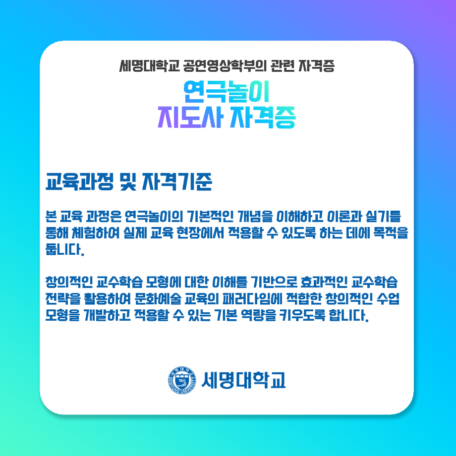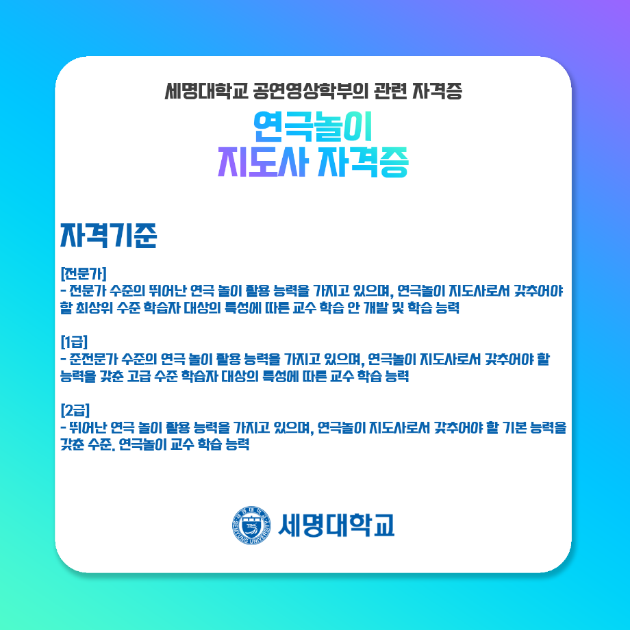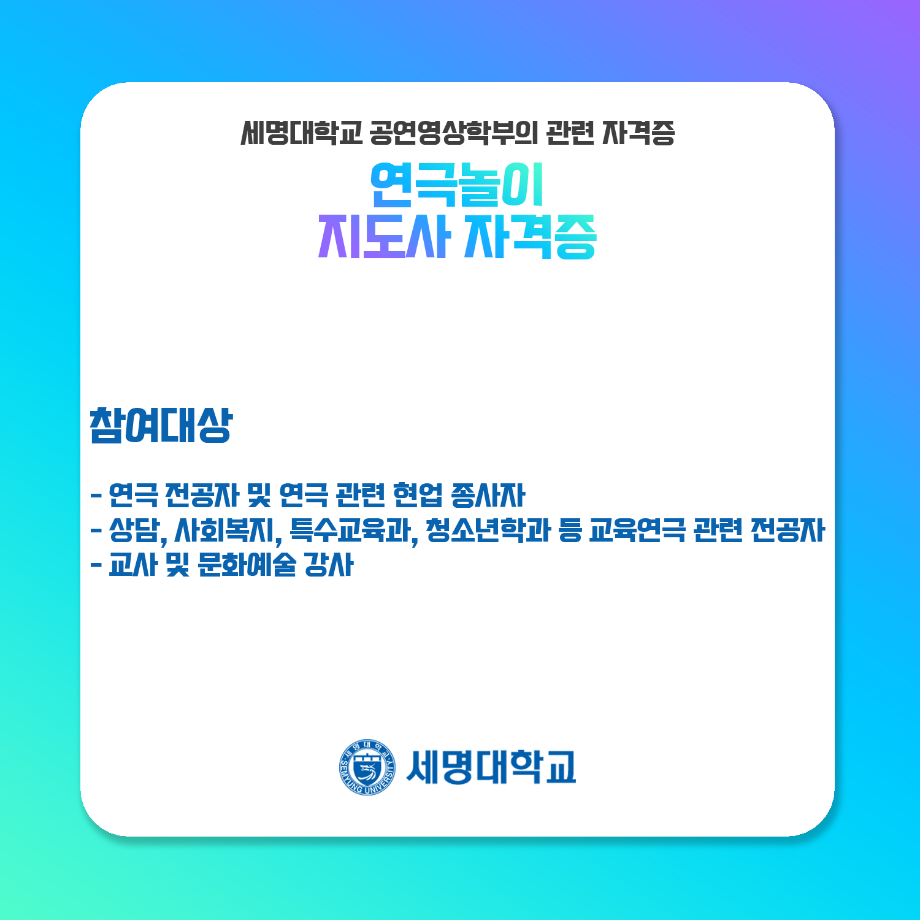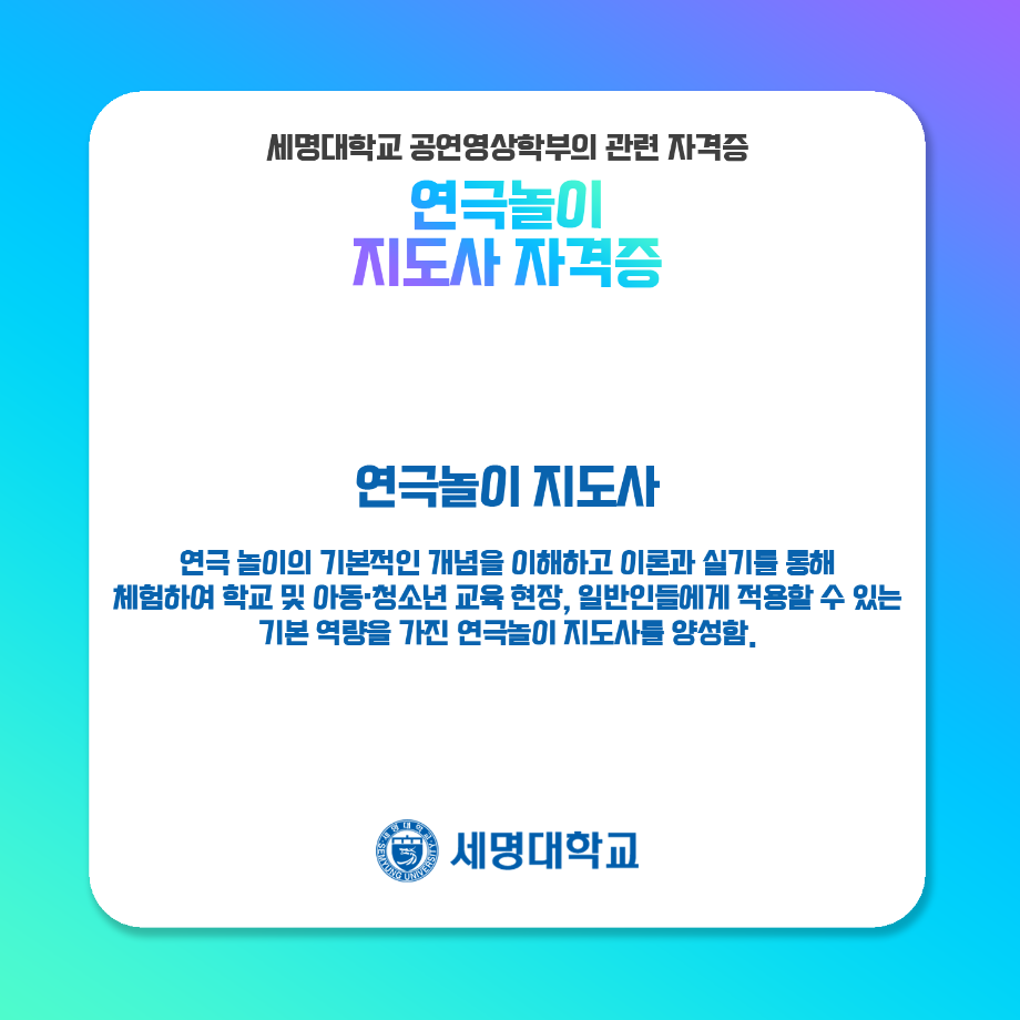 본문 시작 홈으로 학과과정 학과소개 입학정보 교수소개 학과과정 커뮤니티 공연예매 안내 홈페이지가이드 비교과프로그램 교육과정 전공교육 체계도 비교과프로그램 MOU 체결 연극놀이 지도사 양성 교육 하계, 동계 프로젝트 연극놀이 지도사 양성 교육 현장실습 프로그램 액팅플러스 연극놀이 지도사 양성 교육 페이스북 트위터 프린트 연극놀이 지도사 자격증 연기예술학과 4545 2022-01-15 세명대학교 연기예술학과에서는 학과생들을 위하여 매년 연극놀이지도사 자격증 취득을 위한 교육을 지원하고 있습니다. ㅤㅤ 한국임상연극심리치료협회의 지도하에 많은 학생들이 교육 과정을 이수하여 100%의 합격률을 자랑하고 있는 연극놀이지도사 자격증에 대하여 알려드립니다! 목록 다음 무대예술 전문인 자격증 만족도조사 만족도 조사 이 페이지에서 제공하는 정보에 대하여 만족하시나요? 매우만족 만족 보통 불만족 매우불만족