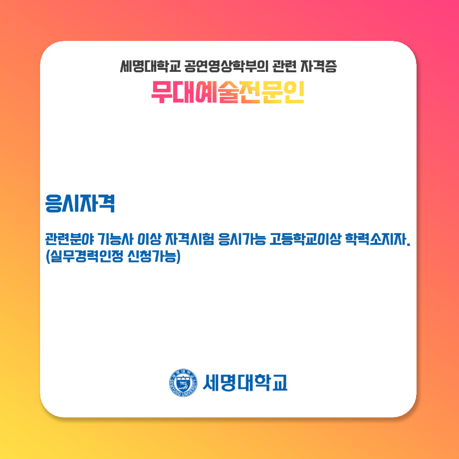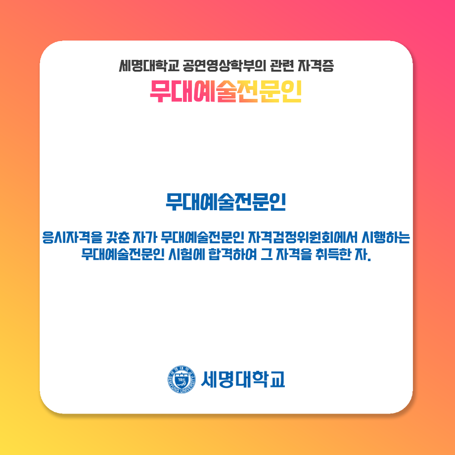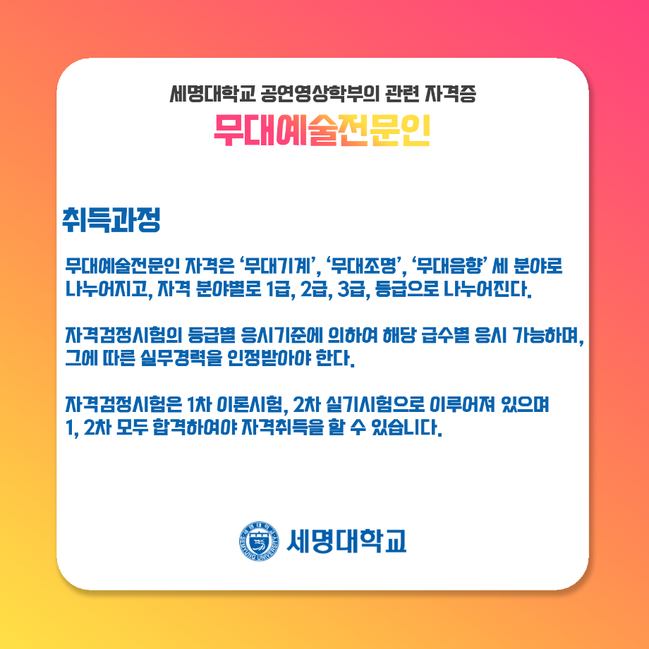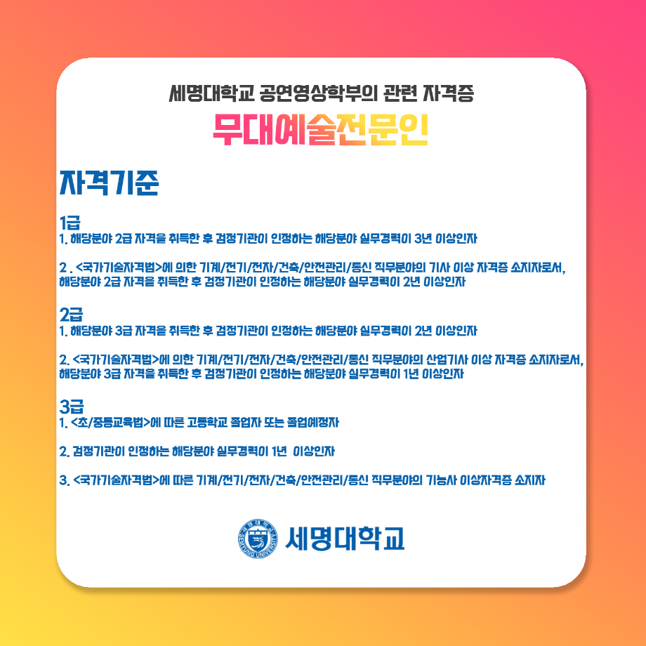 본문 시작 홈으로 학과과정 학과소개 입학정보 교수소개 학과과정 커뮤니티 공연예매 안내 홈페이지가이드 비교과프로그램 교육과정 전공교육 체계도 비교과프로그램 MOU 체결 연극놀이 지도사 양성 교육 하계, 동계 프로젝트 연극놀이 지도사 양성 교육 현장실습 프로그램 액팅플러스 연극놀이 지도사 양성 교육 페이스북 트위터 프린트 무대예술 전문인 자격증 연기예술학과 4276 2022-01-16 세명대학교 연기예술학과에서는 학과생을 위하여 매년 무대예술전문인 자격증 취득을 위한 교육을 지원하고 있습니다. ㅤㅤ 제 1전공뿐만이 아닌 학부와 관련된 다양한 전공을 경험하면서 스탭 분야별(무대, 조명, 음향)로 전공 지식을 함양함과 동시에 초대 강사님들의 지도하에 많은 학생들이 교육 과정을 이수하고 있습니다! 목록 이전연극놀이 지도사 자격증 이전연극놀이 지도사 양성 교육 1일차 활동 사진 만족도조사 만족도 조사 이 페이지에서 제공하는 정보에 대하여 만족하시나요? 매우만족 만족 보통 불만족 매우불만족