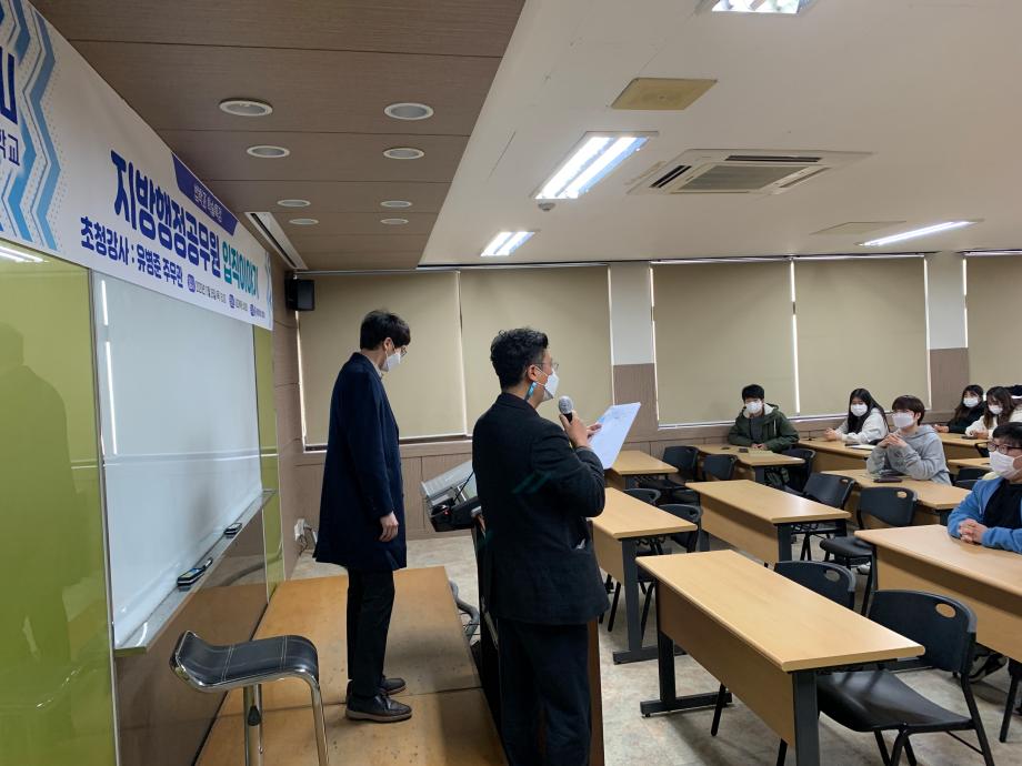 본문 시작 홈으로 학과과정 학과안내 교수소개 학과과정 커뮤니티 홈페이지가이드 비교과프로그램 교육과정 전공교육 체계도 대학원 법학과 비교과프로그램 학사일정 공공법무 지원프로그램 공공법무 지원프로그램 기업법무 지원프로그램 공공법무 지원프로그램 페이스북 트위터 프린트 2020.11.26 일반공무원 특강 법학과 3310 2020-11-26 2020년 11월 16일 유병준 주무관님을 모시고 '지방행정공무원 입직 이야기' 이라는 주제로 특강을 진행하였습니다. 목록 다음 2021.05.25 경찰 공무원 특강 이전2020.11.19 경찰 공무원 특강 담당부서 : 법학과 담당자 : - 연락처 : 043-649-1764 최종수정일 : 2024-10-26 만족도조사 만족도 조사 이 페이지에서 제공하는 정보에 대하여 만족하시나요? 매우만족 만족 보통 불만족 매우불만족