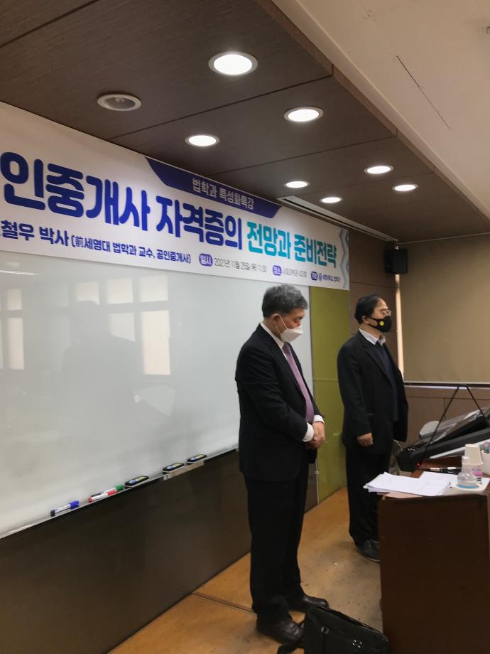 본문 시작 홈으로 학과과정 학과안내 교수소개 학과과정 커뮤니티 홈페이지가이드 비교과프로그램 교육과정 전공교육 체계도 대학원 법학과 비교과프로그램 학사일정 기업법무 지원프로그램 공공법무 지원프로그램 기업법무 지원프로그램 기업법무 지원프로그램 페이스북 트위터 프린트 2021 11. 25. 공인중개사 특강 법학과 3127 2021-11-25 2021년 11월 25일 前 세명대학교 교수님이셨던 노철우 공인중개사님을 모시고 ' 공인중개사 자격증의 전망과 준비전략' 이라는 주제로 특강을 진행하였습니다. ※본 특강은 코로나19 방역 수칙을 준수하여 진행하였습니다.※ 목록 다음 2021. 11. 26. 신변보호사 자격증(1차) 이전2021. 11. 24 공인중개사 특강 담당부서 : 법학과 담당자 : - 연락처 : 043-649-1764 최종수정일 : 2024-10-26 만족도조사 만족도 조사 이 페이지에서 제공하는 정보에 대하여 만족하시나요? 매우만족 만족 보통 불만족 매우불만족
