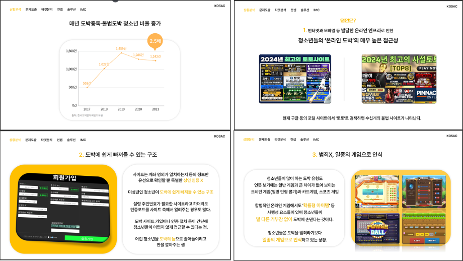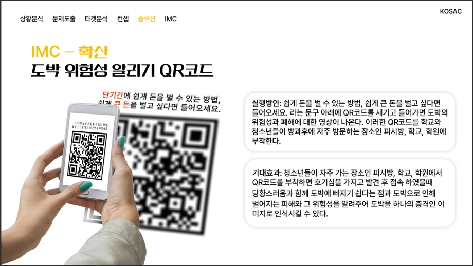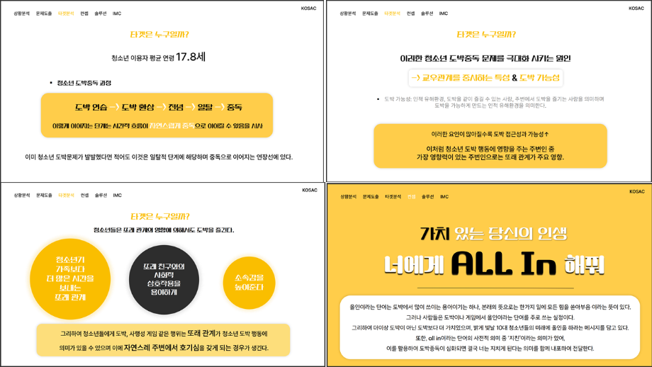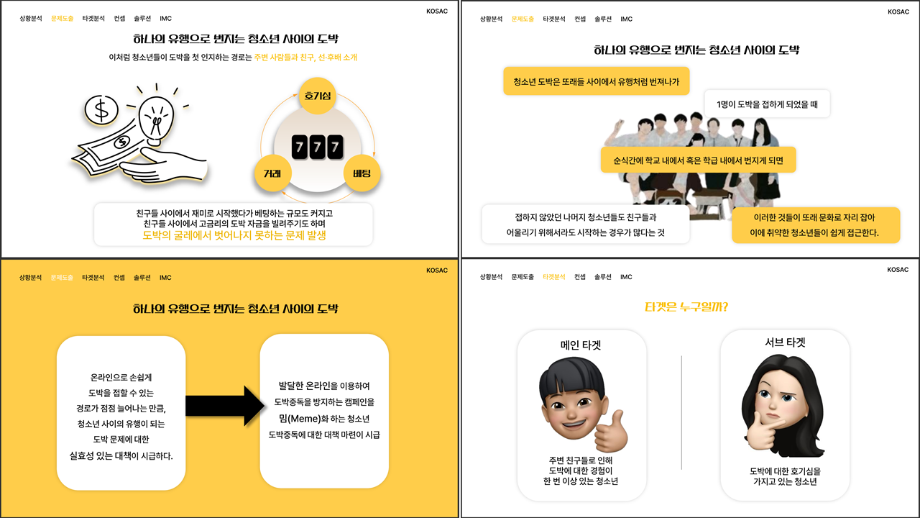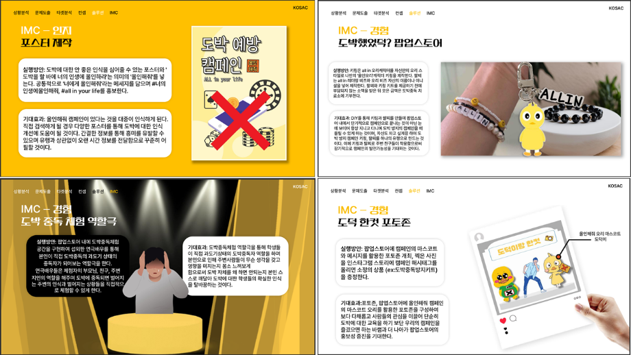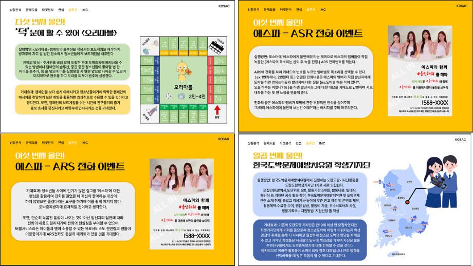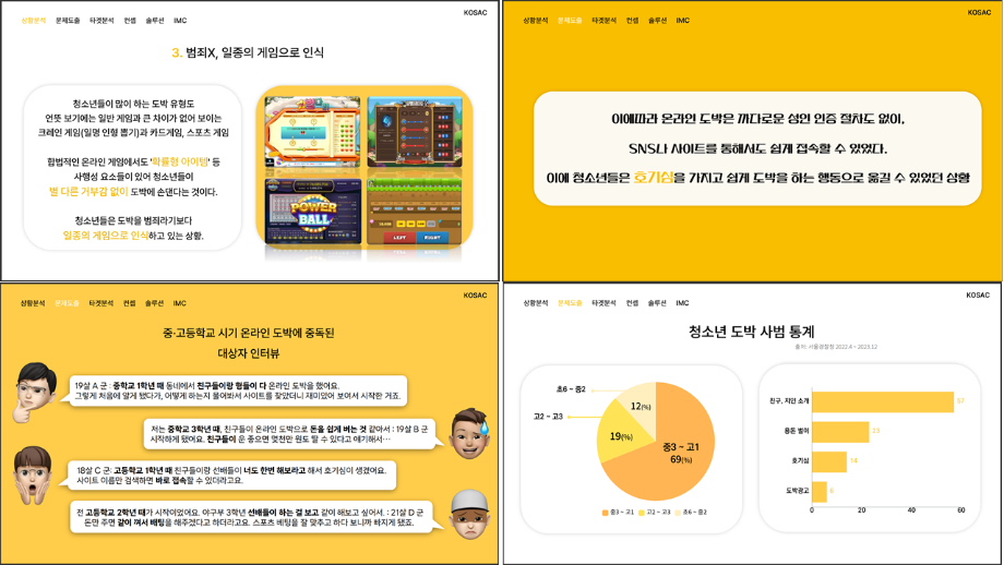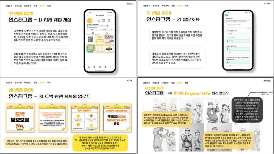본문 시작 홈으로 흥미로운 교육과정 매력적인 학과소개 흥미로운 교육과정 특별CC프로그램 We can 취업 따뜻한 커뮤니티 홈페이지가이드 작품 갤러리 교육일정 교육과정 전공교육 체계도 졸업후진로 작품 갤러리 작품 갤러리 페이스북 트위터 프린트 [2024KOSAC]대한민국대학생광고대회 출품작 광고홍보학과 3801 2024-09-09 2024년도 대한민국 대학생 광고대회 출품작 주제 : 청소년 도박중독 방지를 위한 국민 참여 캠페인 제안서 세명대 광고홍보학과는 '기획맛집'을 지향하고, 이를 인정받고 있습니다 : ) 목록 이전[사회과학조사방법론]키오스경험인식조사 다음 [2024KOSAC]대한민국대학생광고대회 출품작