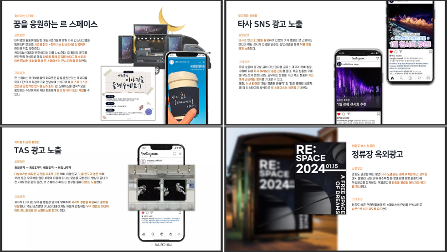 본문 시작 홈으로 흥미로운 교육과정 매력적인 학과소개 흥미로운 교육과정 특별CC프로그램 We can 취업 따뜻한 커뮤니티 홈페이지가이드 작품 갤러리 교육일정 교육과정 전공교육 체계도 졸업후진로 작품 갤러리 작품 갤러리 페이스북 트위터 프린트 [광고홍보캡스톤디자인]Le Space 브랜드 관리 방안 광고홍보학과 3081 2024-01-04 광고홍보캡스톤디자인 수업 결과물 산학협력 프로그램 : "Le Space 브랜드 관리 방안" 목록 이전[광고캠프]도시브랜드제고방안기획서 다음 [공공캠페인]서울시 공공디자인 공모전 수상작