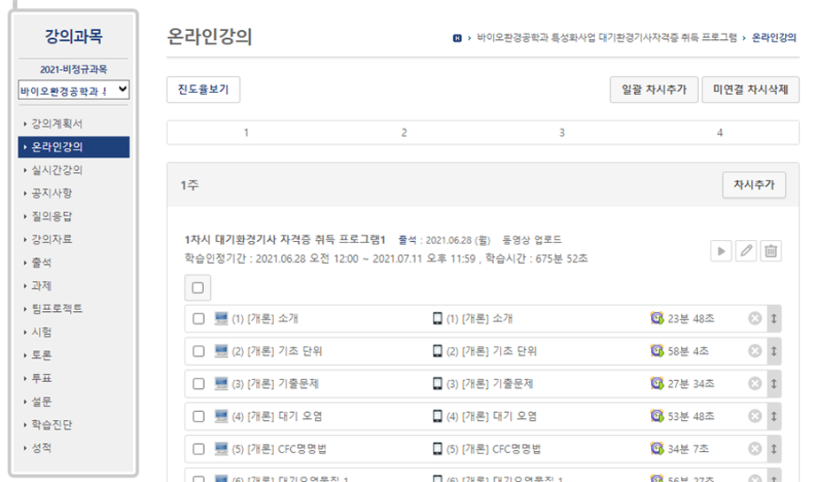 본문 시작 홈으로 학과과정 학과소개 교수소개 학과과정 커뮤니티 홈페이지가이드 비교과프로그램 교육과정 전공교육 체계도 졸업요건 비교과프로그램 특성화 환경기사자격증 취득 특성화 환경기사자격증 취득 환경기사자격증 멘토링 시스템 환경기사자격증 단기실무 학과 특성화 포인트 제도 대학혁신지원Creative Cube 특성화 환경기사자격증 취득 페이스북 트위터 프린트 2021학년도 특성화 환경기사 자격증 취득 프로그램 시행 바이오환경공학과 3585 2022-01-26 2021학년도 특성화 환경기사 자격증 취득 프로그램을 하계 방학동안 비대면으로 실시하였습니다. 본 프로그램을 통해 재학생들이 환경기사 자격증을 취득하며 진로 의사결정에 도움이 되었으면 좋겠습니다! 다음 학년도에도 많은 관심과 참여 해주시고 자격증 취득을 기원합니다! 목록 이전특성화 환경기사 자격증 프로그램 담당부서 : 환경에너지학과 담당자 : - 연락처 : 043-649-1337 최종수정일 : 2024-10-26 만족도조사 만족도 조사 이 페이지에서 제공하는 정보에 대하여 만족하시나요? 매우만족 만족 보통 불만족 매우불만족
