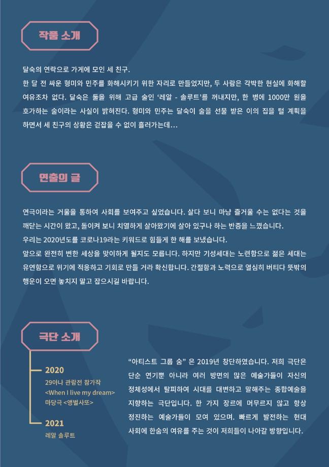 본문 시작 홈으로 학과소개 학과소개 입학정보 교수소개 학과과정 커뮤니티 공연예매 안내 홈페이지가이드 진로 학과개요 학과장인사말 학과연혁 세명대학교 민송아트홀 학과행사 진로 진로 페이스북 트위터 프린트 - 졸업생 창단 극단 ‘아티스트 그룹 숨’ 정기 공연 안내 연기예술학과 2190 2021-04-06 “일어나라, 자본주의의 반항아들아.” 🎓 졸업생 12학번 오기택 선배님이 창단한 [아티스트 그룹 숨] 두 번째 정기 공연작 <레알 솔루트> 🎓 일시 : 2021. 04. 06 (화) - 2021. 04. 18 (일) 목록 다음 졸업생 이현석 배우 국립극단 <무중력 연애 : 낭독 공연> 다음 졸업생 장하다, 극단 늘품의 ‘ 후설’ 무대 특별상 수상 만족도조사 만족도 조사 이 페이지에서 제공하는 정보에 대하여 만족하시나요? 매우만족 만족 보통 불만족 매우불만족
