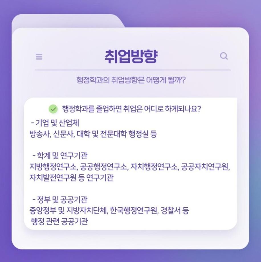 3️⃣ 행정학과에 진학하면 공무원, 공사 및 정부 투자기관 직원, 기업체 직원, 언론인, 금융기관 직원, 일반 사기업 등 여러 방향으로 취업할 수 있습니다.