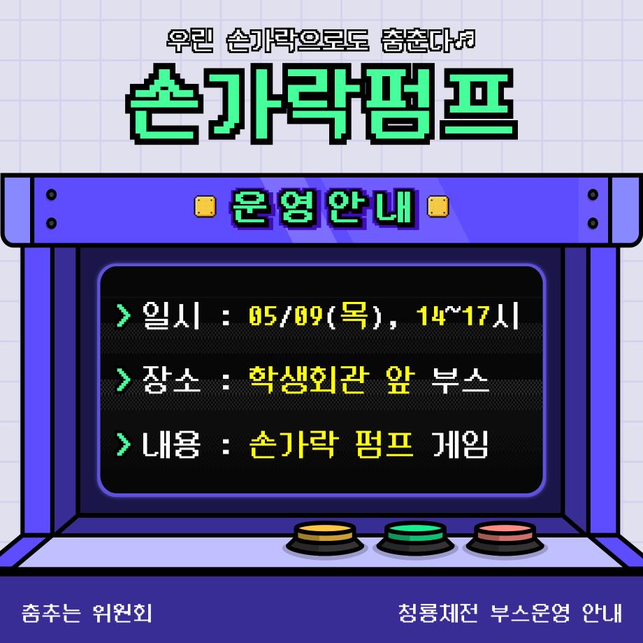 4. 활동목적 : 청룡체전 기간, 부스를 운영하여 ‘춤추는 위원회’ 소개 및 올해 활동계획을 안내하고, 간단한 체험 활동(미니게임)을 진행함으로써 ‘춤추는 위원회’에 대한 재학생들의 관심과 참여를 유도하여 ‘춤추는 위원회’를 적극 홍보하기 위함