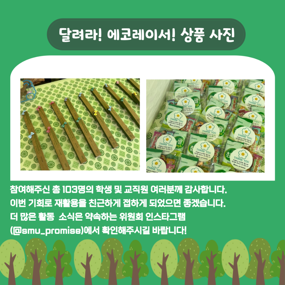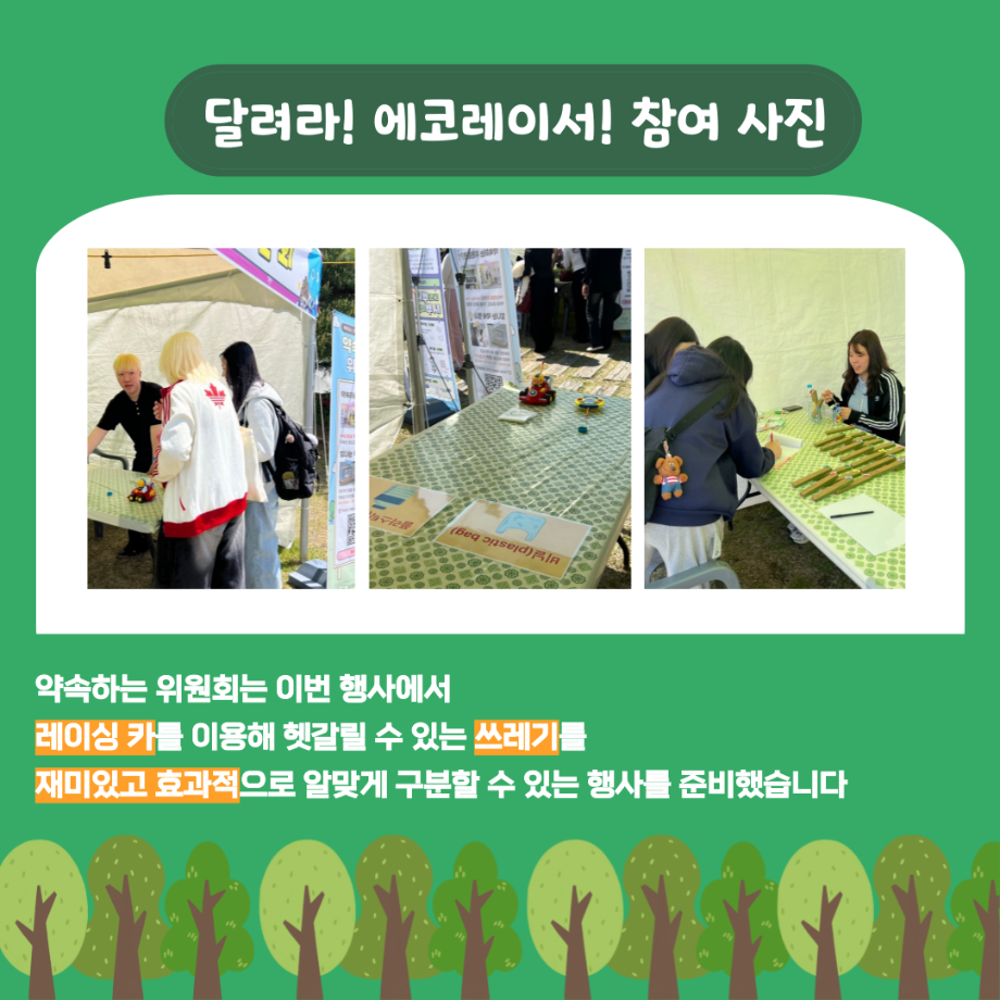 본문 시작 홈으로 포토갤러리 학생위원회 개요 학생위원회 소개 공지사항 활동결과 홈페이지가이드 포토갤러리 페이스북 트위터 프린트 [약속하는 위원회] 달려라 에코레이서 학술정보원 930 2025-05-15 안녕하세요 재미있는 경험을 위한 학생위원회 '약속하는 위원회' 입니다! 약속하는 위원회 행사인 달려라! 에코레이서! 활동이 성황리에 마무리 되었습니다 :) [달려라! 에코레이서! 행사 결과] 일시 : 2025년 5월 14일(수) 10:00 ~ 13:30 장소 : 뭐든지 광장 행사 참여자 : 103명 달려라! 에코레이서! 행사에 참여해주신 모든 분들께 진심으로 감사 드립니다! 추후에 이어질 약속하는 위원회 활동도 많은 관심 바랍니다! 목록 이전[꽃피는 위원회] 제4회 벚꽃축제 '벚꽃세봄' 다음 [꽃피는 위원회] 제 4회 사랑의 꽃집사 체험이벤트 담당부서 : 장학복지팀 담당자 : - 연락처 : 043-649-1142 최종수정일 : 2024-10-26 만족도조사 만족도 조사 이 페이지에서 제공하는 정보에 대하여 만족하시나요? 매우만족 만족 보통 불만족 매우불만족