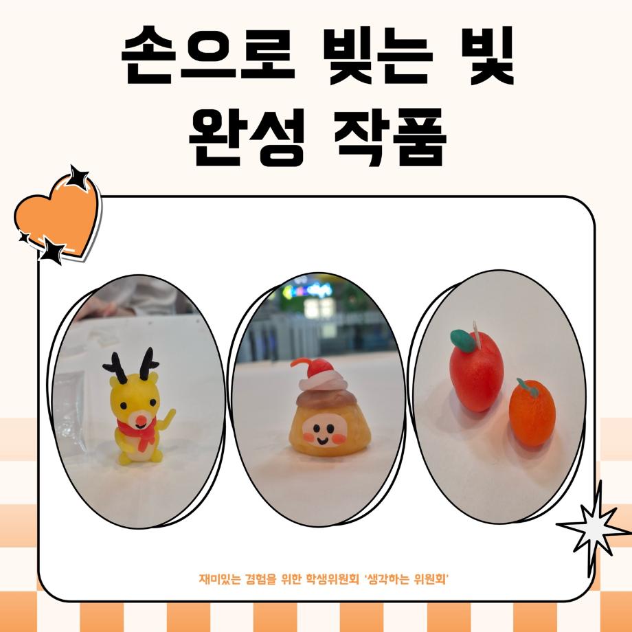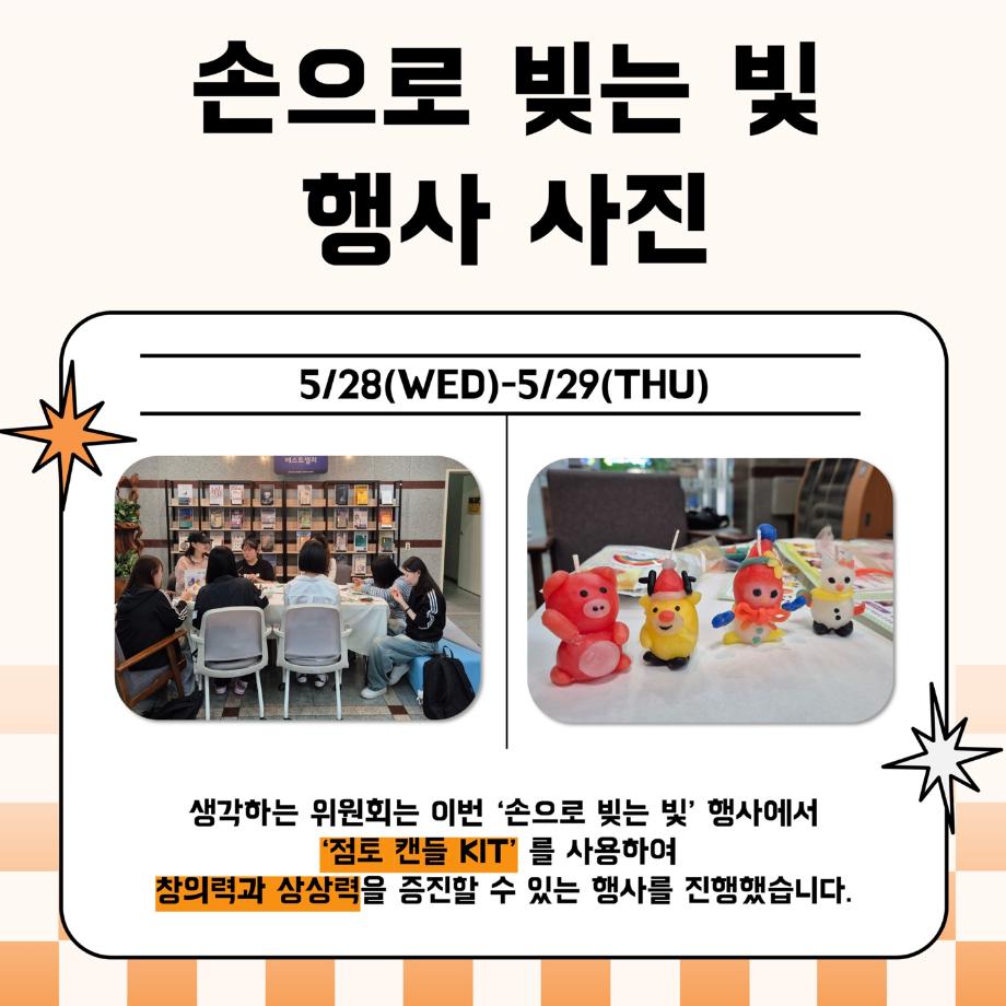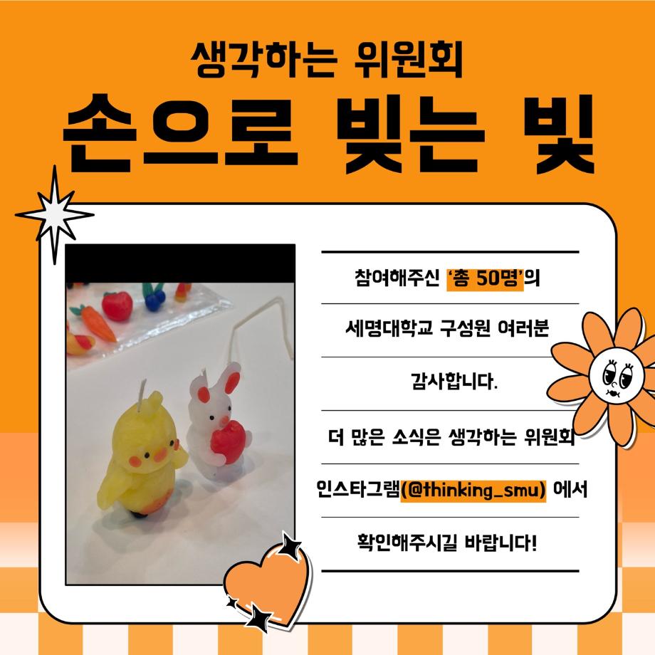 본문 시작 홈으로 포토갤러리 학생위원회 개요 학생위원회 소개 공지사항 활동결과 홈페이지가이드 포토갤러리 페이스북 트위터 프린트 [생각하는 위원회] 손으로 빚는 빛 학술정보원 1192 2025-05-30 프로그램명 : 손으로 빚는 빛 일시 : 2025년 5월 28일(수)~29일(목) 13:30~16:00 장소 : 도서관 2층 로비 활동내용 : 점토양초 DIY로 나만의 양초 만들기 행사 참여자 : 50명 안녕하세요! 재미있는 경험을 위한 학생위원회 '생각하는 위원회'입니다 :) 손으로 빚는 빛 행사에 참여해주신 모든 분들께 감사드립니다! 앞으로도 생각하는 위원회의 활동들에 많은 관심 부탁드립니다🤍 목록 다음 [생각하는 위원회] 대형 현수막 문구 공모전 'Hear, 위로' 다음 [약속하는 위원회] 뽕뽕오락실 담당부서 : 장학복지팀 담당자 : - 연락처 : 043-649-1142 최종수정일 : 2024-10-26 만족도조사 만족도 조사 이 페이지에서 제공하는 정보에 대하여 만족하시나요? 매우만족 만족 보통 불만족 매우불만족