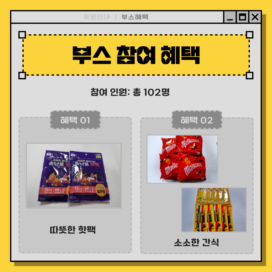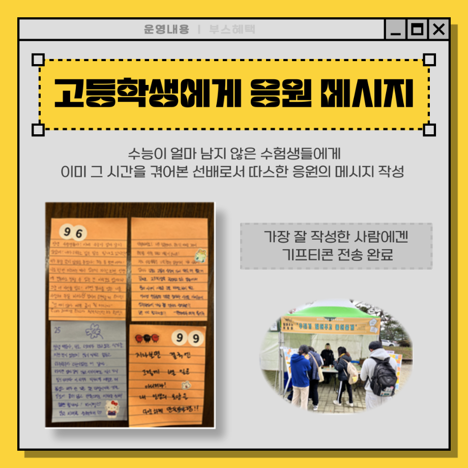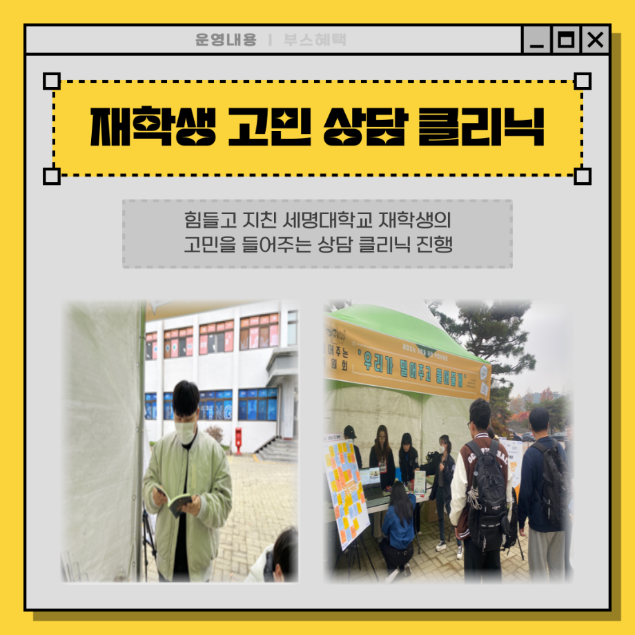 본문 시작 홈으로 포토갤러리 학생위원회 개요 학생위원회 소개 공지사항 활동결과 홈페이지가이드 포토갤러리 페이스북 트위터 프린트 [밀어주는 위원회] 2023년 2학기. 두 번째 행사 입학관리본부 3258 2023-11-09 1. 행사일정 : 2023.11.01.(수) 2. 행사장소 : 세명스퀘어(학생회관 앞 광장) 3. 행사내용 - 세명대학교 재학생들이 고3 수험생들에게 수능 응원 메시지 보내기 - 재학생 고민 상담 클리닉 4. 행사참여인원 : 102명 목록 이전[착한 위원회] 2023-2학기 포롱포롱 공방 운영 결과 다음 [착한위원회] 최종보고회 착한위원회SNS팔로우 이벤트 담당부서 : 장학복지팀 담당자 : - 연락처 : 043-649-1142 최종수정일 : 2024-10-26 만족도조사 만족도 조사 이 페이지에서 제공하는 정보에 대하여 만족하시나요? 매우만족 만족 보통 불만족 매우불만족