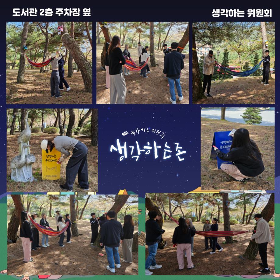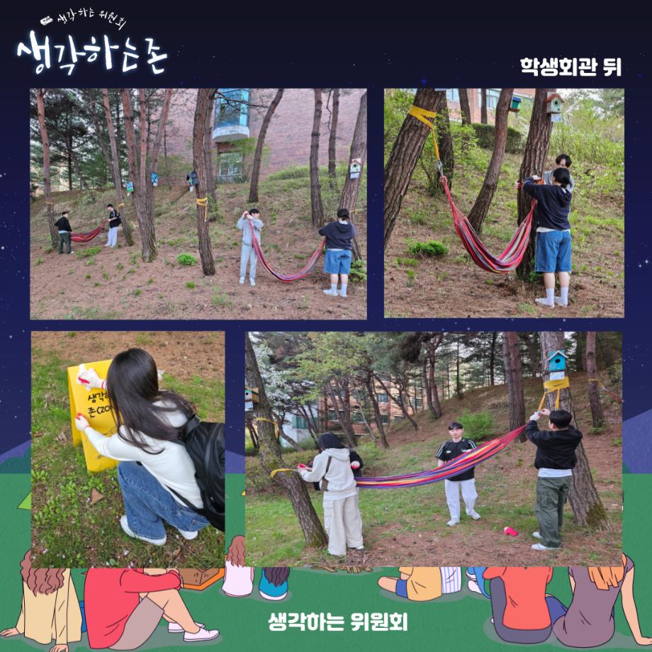 재미있는 경험을 위한 학생위원회 ‘생각하는 위원회’는 학생들의 수요를 반영하기 위해 4월 8일~16일까지 위치를 설문조사하여 선정된 1순위 학생회관 뒤, 2순위 도서관 2층 주차장 옆 생각하는 존 위치에 4월 18일(목) 해먹을 설치하였고 건의사항에 위생, 청결 문제가 언급되어 환경미화 활동까지 동시에 진행하였다.
