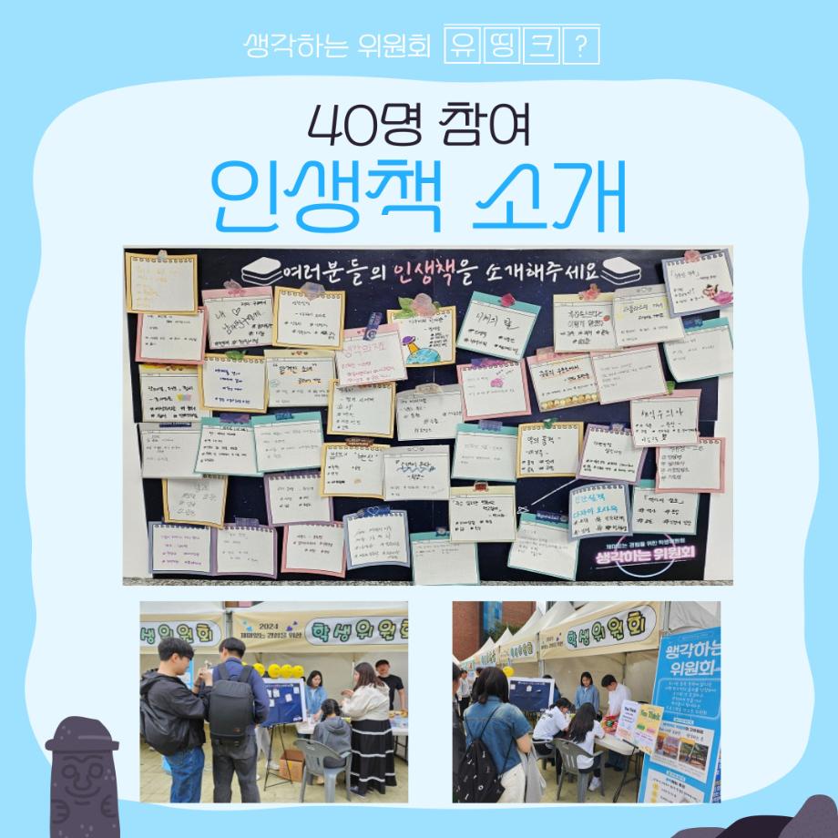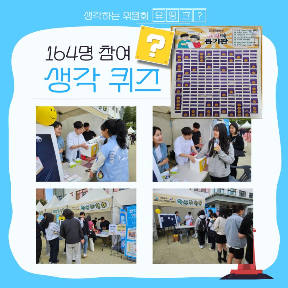 본문 시작 홈으로 포토갤러리 학생위원회 개요 학생위원회 소개 공지사항 활동결과 홈페이지가이드 포토갤러리 페이스북 트위터 프린트 [생각하는 위원회] You Think?(유띵크) 청룡체전부스 학술정보원 1789 2024-05-13 일시 : 2024.05.08(수) 14:00~17:00 장소 : 학생회관 앞 광장 학생위원회 부스 활동내용 : 생각퀴즈(생각박스, 상식퀴즈, 난센스퀴즈) 진행 참여인원 : 164명 참여 생각하는 위원회 행사에 많은 관심과 참여해 주신 구성원 여러분께 감사의 말씀드립니다! 추천해주신 인생책은 5월말 생각하는 위원회 행사에 반영될 예정입니다. 앞으로의 행사도 함께해 주세요:) 목록 이전[꽃피는 위원회] 행운을 가져다주는 책갈피 만들기 다음 [약속하는 위원회] <약속편지> 담당부서 : 장학복지팀 담당자 : - 연락처 : 043-649-1142 최종수정일 : 2024-10-26 만족도조사 만족도 조사 이 페이지에서 제공하는 정보에 대하여 만족하시나요? 매우만족 만족 보통 불만족 매우불만족