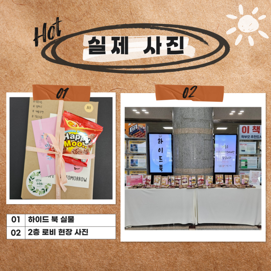 하이드 북은 체전 부스에서 추천받았던 인생책과 위원회 자체 선발을 통해 선정한 도서를 포장하여 다른 구성원이 키워드만 보고 대출함으로써 같은 책을 공유하지만 다른 생각을 할 수 있게 하는 프로그램입니다.