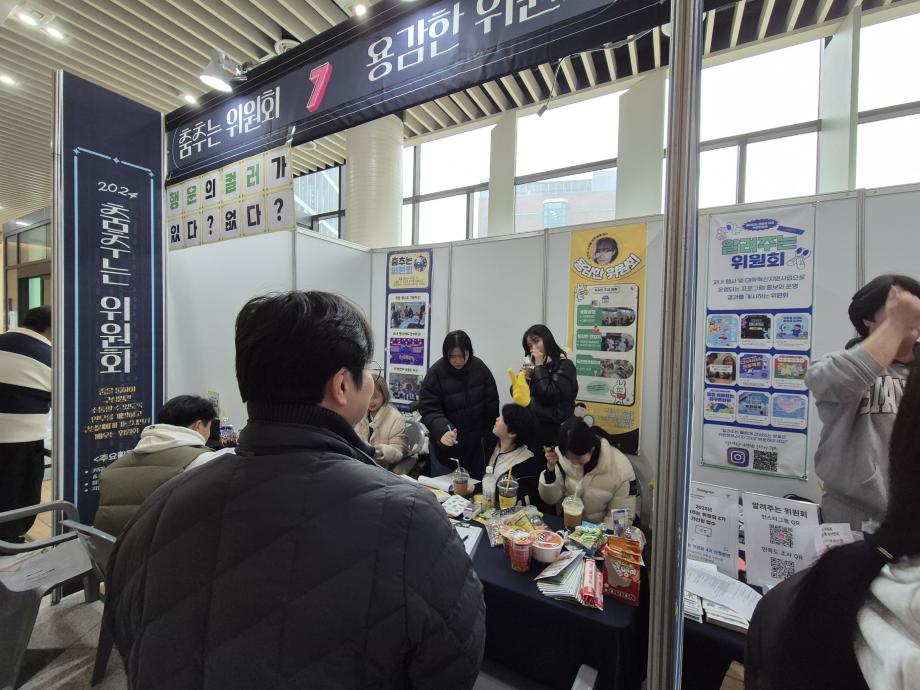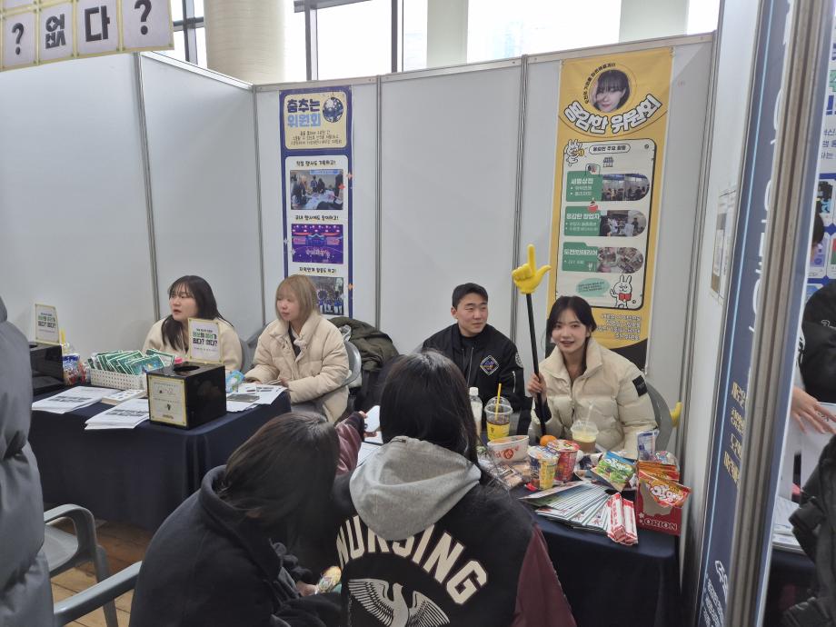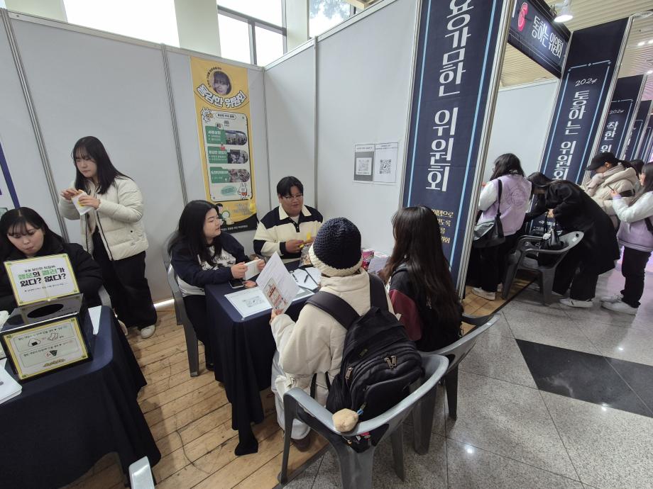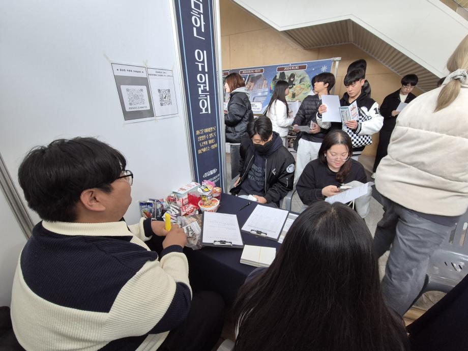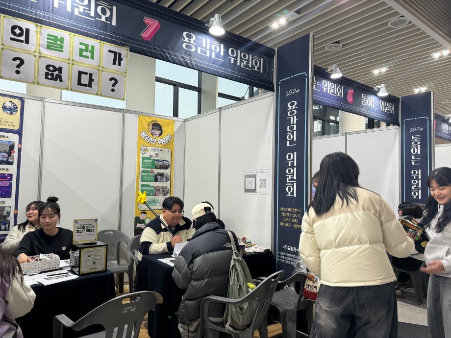 용감한 위원회 마지막 행사로 최종보고회 부스를 운영하였습니다! 한 해 동안 진행한 활동들에 대한 설문조사와 더불어 용감한 위원회가 어떤 위원회인지 상담을 통해 용감한 위원회 가신청 접수도 받고, 이렇게 끝나면 너무 심심한 최종보고회 부스라 생각해서 아주아주 간단한 참참참 미니게임을 진행하였는데 생각보다 많은 재학생 분들이 참여해주셨습니다! 설문조사 결과를 확인해 보니 2024학년도 용감한 위원회가 열심히 활동한 보람이 있었습니다. 내년 2025학년도에는 지금보다 더 재학생들의 의견을 수렴해 활동을 진행 할 예정이니 앞으로도 많은 관심 부탁드립니다! ♥♥