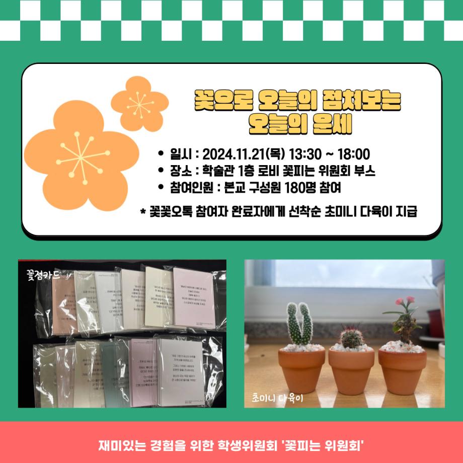 본문 시작 홈으로 포토갤러리 학생위원회 개요 학생위원회 소개 공지사항 활동결과 홈페이지가이드 포토갤러리 페이스북 트위터 프린트 [꽃피는 위원회] 오늘의 운세 꽃꽃오톡 학생처 2115 2024-11-30 꽃피는 위원회 [오늘의 운세 꽃꽃오톡] 일시 : 2024.11.21(목) 13:30 ~ 재료소진시 까지 장소 : 학술관 1층 학생위원회 부스 참여조건 : 꽃피는 위원회 활동 만족도 조사 참여자 내용 : 랜덤돌리기를 통한 꽃운세를 점쳐보고 선착순 초미니 다육이 선물받기 참여인원 : 본교 구성원 180명 참여 목록 다음 용감한 위원회 「최종보고회」 홍보부스 운영 다음 [용감한 위윈회]나만의 하바리움, 공방 창업의 시작! 담당부서 : 장학복지팀 담당자 : - 연락처 : 043-649-1142 최종수정일 : 2024-10-26 만족도조사 만족도 조사 이 페이지에서 제공하는 정보에 대하여 만족하시나요? 매우만족 만족 보통 불만족 매우불만족
