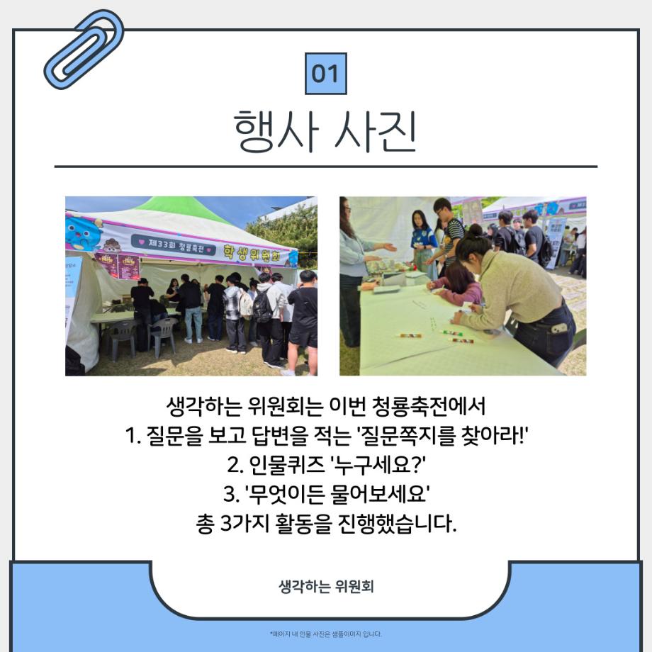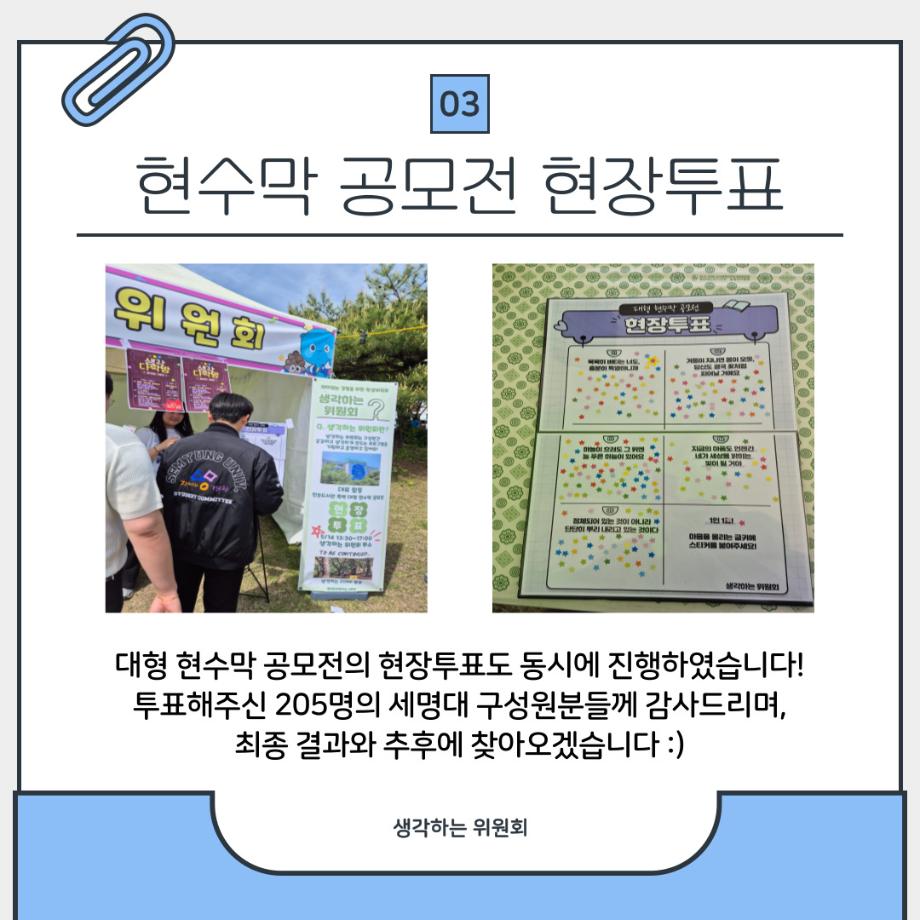 본문 시작 홈으로 포토갤러리 학생위원회 개요 학생위원회 소개 공지사항 활동결과 홈페이지가이드 포토갤러리 페이스북 트위터 프린트 [생각하는 위원회]생각 다락방 학술정보원 1277 2025-05-22 프로그램명 : 생각 다락방 일시 : 2025.05.14(수) 13:30~17:00 장소 : 뭐든지 광장 학생위원회 부스 활동내용 : 질문쪽지 찾기, 인물퀴즈, 무엇이든 물어보세요, 대형현수막 공모전 현장투표 참여인원 : 부스 행사 161명 참여, 대형현수막 공모전 현장투표 205명 참여 대형현수막 공모전 현장투표는 추후에 최종 결과를 만나보실 수 있습니다🤍 앞으로도 생각하는 위원회와 함께 해요! 목록 이전[약속하는 위원회] 빛나는 약속 이전[꽃피는 위원회] 제4회 벚꽃축제 '벚꽃세봄' 담당부서 : 장학복지팀 담당자 : - 연락처 : 043-649-1142 최종수정일 : 2024-10-26 만족도조사 만족도 조사 이 페이지에서 제공하는 정보에 대하여 만족하시나요? 매우만족 만족 보통 불만족 매우불만족