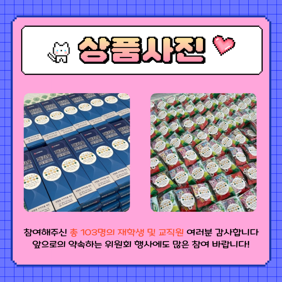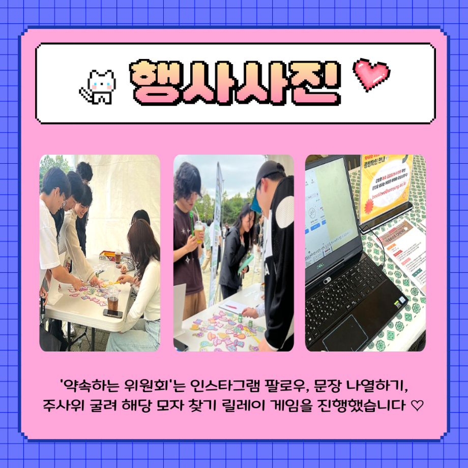 본문 시작 홈으로 포토갤러리 학생위원회 개요 학생위원회 소개 공지사항 활동결과 홈페이지가이드 포토갤러리 페이스북 트위터 프린트 [약속하는 위원회] 뽕뽕오락실 학술정보원 566 2025-09-24 안녕하세요 재미있는 경험을 위한 학생위원회 '약속하는 위원회' 입니다! 약속하는 위원회 행사인 뿅뿅! 약속오락실! 활동이 성황리에 마무리 되었습니다 :) [뿅뿅! 약속오락실! 행사 결과] 일시 : 2025년 9월 24일(수) 14시~17시 장소 : 학생회관 앞 광장 행사 참여자 : 103명 뿅뿅! 약속오락실! 행사에 참여해주신 모든 분들께 진심으로 감사드립니다! 추후에 이어질 약속하는 위원회 활동도 많은 관심 바랍니다! 목록 이전[생각하는 위원회] 손으로 빚는 빛 다음 [꽃피는 위원회] 꽃 돌려라 피어라 담당부서 : 장학복지팀 담당자 : - 연락처 : 043-649-1142 최종수정일 : 2024-10-26 만족도조사 만족도 조사 이 페이지에서 제공하는 정보에 대하여 만족하시나요? 매우만족 만족 보통 불만족 매우불만족