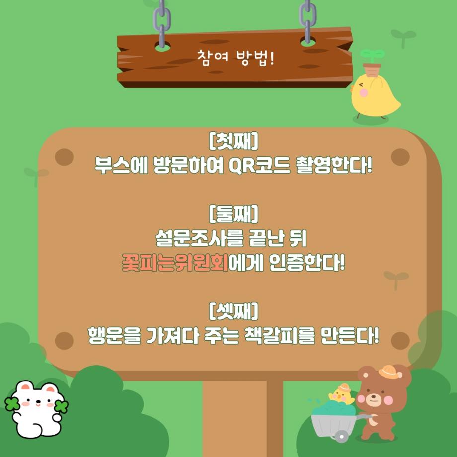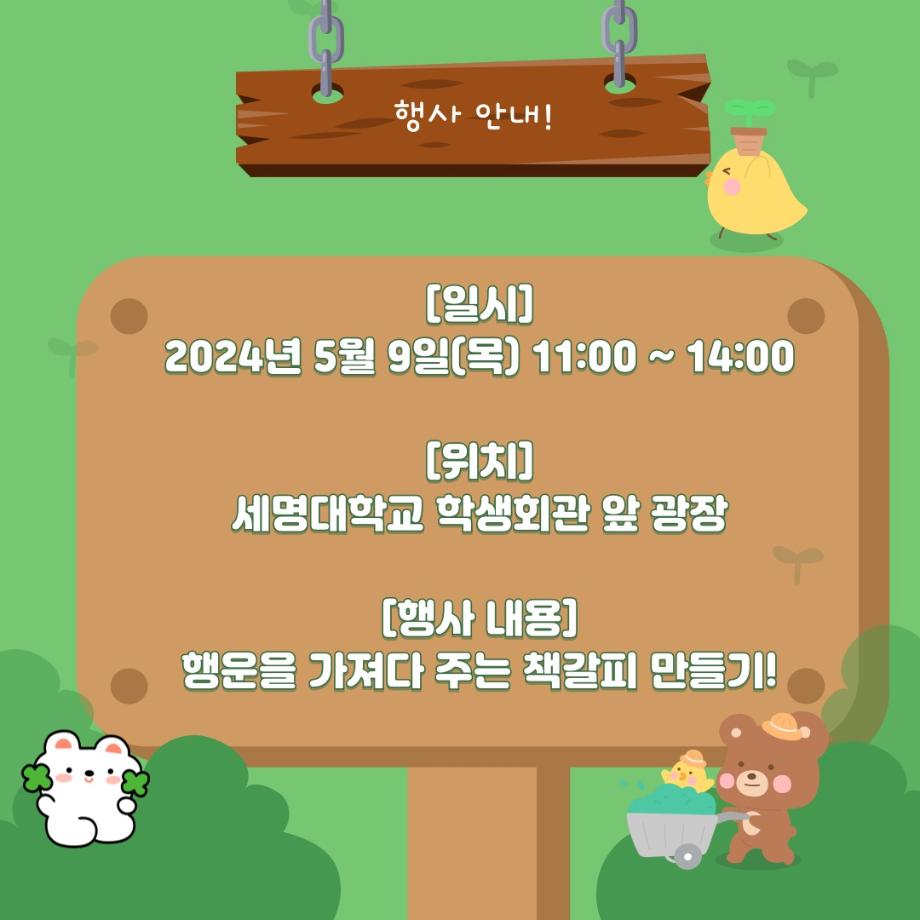 본문 시작 홈으로 공지사항 학생위원회 개요 학생위원회 소개 공지사항 활동결과 홈페이지가이드 프로그램 계획 프로그램 계획 세명대학교 공지사항 프로그램 계획 페이스북 트위터 프린트 [꽃피는 위원회] 행운을 가져다주는 책갈피 만들기 학생처 1764 2024-05-09 행사명 : 행운을 가져다주는 책갈피 만들기 행사일시 : 2024.05.09(목) 11:00시~14시 행사장소 : 학생회관 앞 광장 학생위원회 부스 참여방법 : 꽃피는 위원회 활동 설문조사 완료 인증 후 책갈피 만들기 참여 목록 이전[약속하는 위원회] 약속편지 이전[착한 위원회]제5회 이리오새 페스티벌 담당부서 : 장학복지팀 담당자 : - 연락처 : 043-649-1142 최종수정일 : 2024-10-26 만족도조사 만족도 조사 이 페이지에서 제공하는 정보에 대하여 만족하시나요? 매우만족 만족 보통 불만족 매우불만족