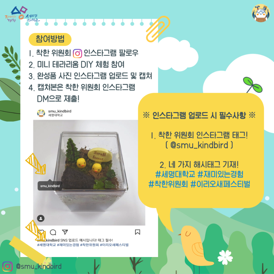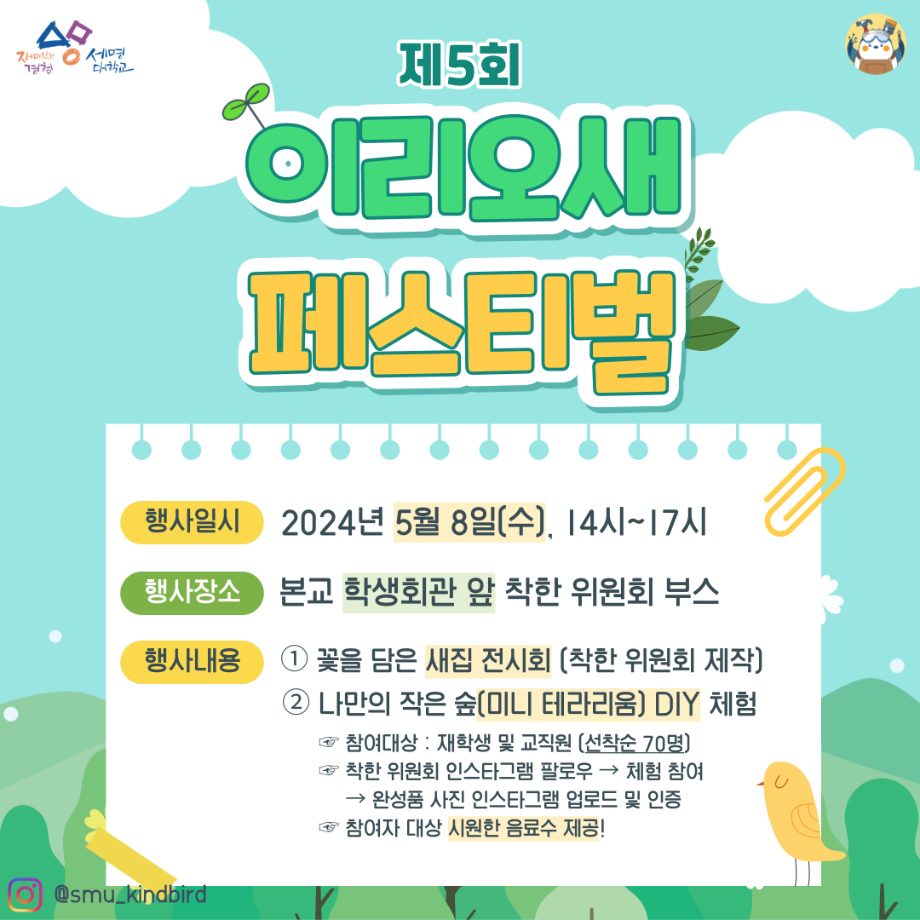 본문 시작 홈으로 공지사항 학생위원회 개요 학생위원회 소개 공지사항 활동결과 홈페이지가이드 프로그램 계획 프로그램 계획 세명대학교 공지사항 프로그램 계획 페이스북 트위터 프린트 [착한 위원회]제5회 이리오새 페스티벌 학생처 1893 2024-05-08 [착한 위원회] 제5회 이리오새 페스티벌 1. 행사일시 : 2024년 5월 8일(수), 14시~17시 2. 행사장소 : 본교 학생회관 앞 착한 위원회 부스 3. 행사내용 - 꽃을 담은 새집 전시회 (착한 위원회 제작) - 나만의 작은 숲(미니 테라리움) DIY 체험 (선착순 70명, 참여자 대상 시원한 음료 제공) 목록 다음 [꽃피는 위원회] 행운을 가져다주는 책갈피 만들기 다음 [생각하는 위원회] 하이드 북 담당부서 : 장학복지팀 담당자 : - 연락처 : 043-649-1142 최종수정일 : 2024-10-26 만족도조사 만족도 조사 이 페이지에서 제공하는 정보에 대하여 만족하시나요? 매우만족 만족 보통 불만족 매우불만족