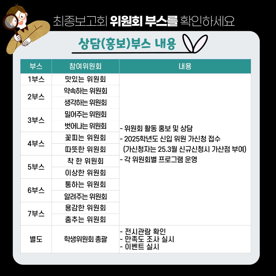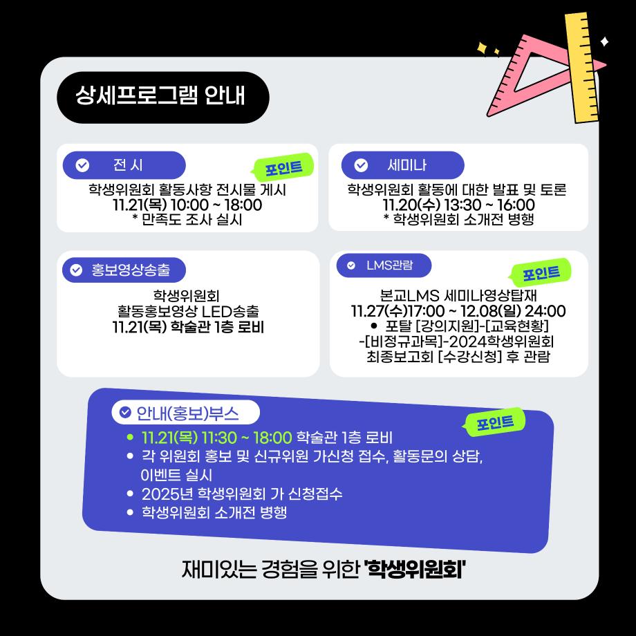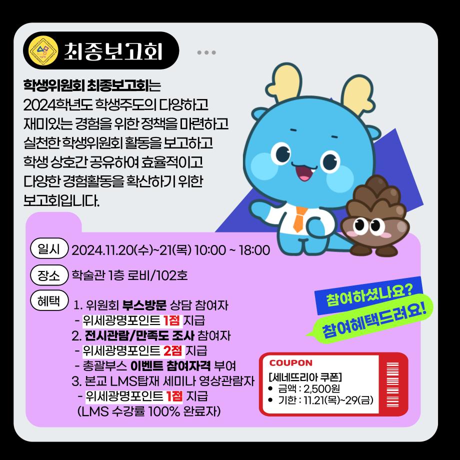 본문 시작 홈으로 공지사항 학생위원회 개요 학생위원회 소개 공지사항 활동결과 홈페이지가이드 프로그램 계획 프로그램 계획 세명대학교 공지사항 프로그램 계획 페이스북 트위터 프린트 학생위원회 최종보고회 학생처 1812 2024-11-20 < 학생위원회 최종보고회 > 일시 : 2024.11.20(수)~21(목) 장소 : 학술관 1층 로비 내용 : 활동실적 발표(세미나), 위원회 소개전, 활동실적 전시(전시), 안내(홍보)부스 진행, 개별 프로그램 진행 목록 이전[이상한 위원회] 이상하거나 '이'상하거나 다음 [따뜻한 위원회] 넌 이름이 뭐니? 담당부서 : 장학복지팀 담당자 : - 연락처 : 043-649-1142 최종수정일 : 2024-10-26 만족도조사 만족도 조사 이 페이지에서 제공하는 정보에 대하여 만족하시나요? 매우만족 만족 보통 불만족 매우불만족