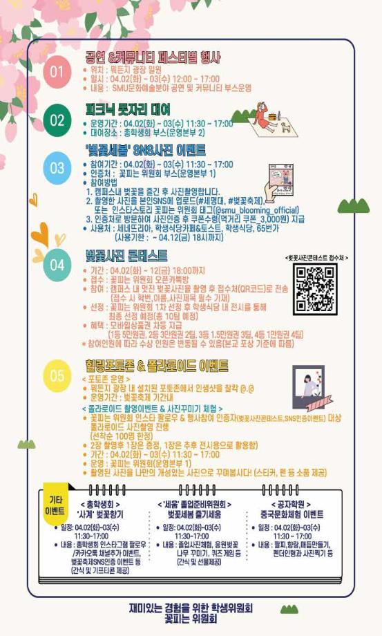 본문 시작 홈으로 공지사항 학생위원회 개요 학생위원회 소개 공지사항 활동결과 홈페이지가이드 프로그램 계획 프로그램 계획 세명대학교 공지사항 프로그램 계획 페이스북 트위터 프린트 [꽃피는 위원회]제 3회 벚꽃축제 진행 학생처 1720 2024-04-02 2024년 세명대학교 제 3회 벚꽃축제를 진행합니다. 벚꽃사진콘테스트, sns사진업로드 이벤트, 폴라로이드이벤트 등 여러가지 프로그램을 실시하오니 많은 참여부탁드립니다. 목록 이전[생각하는 위원회] 제 3차 생각게시판 운영 다음 [약속하는 위원회] 2024년도 약속상점 운영안내 담당부서 : 장학복지팀 담당자 : - 연락처 : 043-649-1142 최종수정일 : 2024-10-26 만족도조사 만족도 조사 이 페이지에서 제공하는 정보에 대하여 만족하시나요? 매우만족 만족 보통 불만족 매우불만족