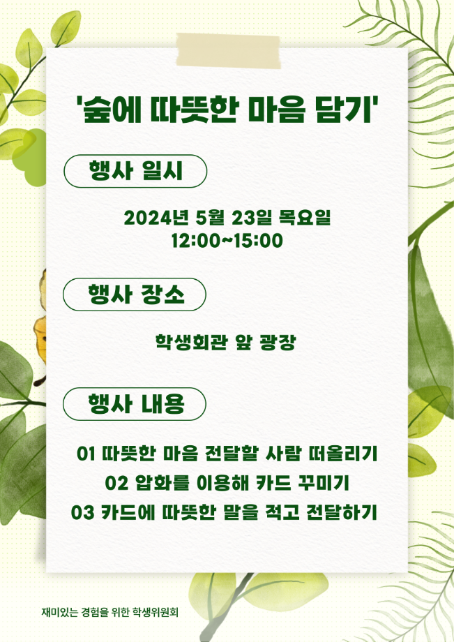 본문 시작 홈으로 공지사항 학생위원회 개요 학생위원회 소개 공지사항 활동결과 홈페이지가이드 프로그램 계획 프로그램 계획 세명대학교 공지사항 프로그램 계획 페이스북 트위터 프린트 [따뜻한 위원회] 숲에 따뜻한 마음 담기 학생처 1402 2024-05-23 [숲에 따뜻한 마음 담기] 일시 : 2024.05.23(목) 장소 : 학생회관 앞 광장 내용 - 따뜻한 마음 전달할 사람 떠올리기 - 압화를 이용한 카드 꾸미기 - 카드에 따뜻한 말 적고 전달하기 목록 이전[맛있는 위원회] 맞그램 틀렸그램 다음 [통하는 위원회] 🔔 MZ 골든벨 개최 🔔 담당부서 : 장학복지팀 담당자 : - 연락처 : 043-649-1142 최종수정일 : 2024-10-26 만족도조사 만족도 조사 이 페이지에서 제공하는 정보에 대하여 만족하시나요? 매우만족 만족 보통 불만족 매우불만족