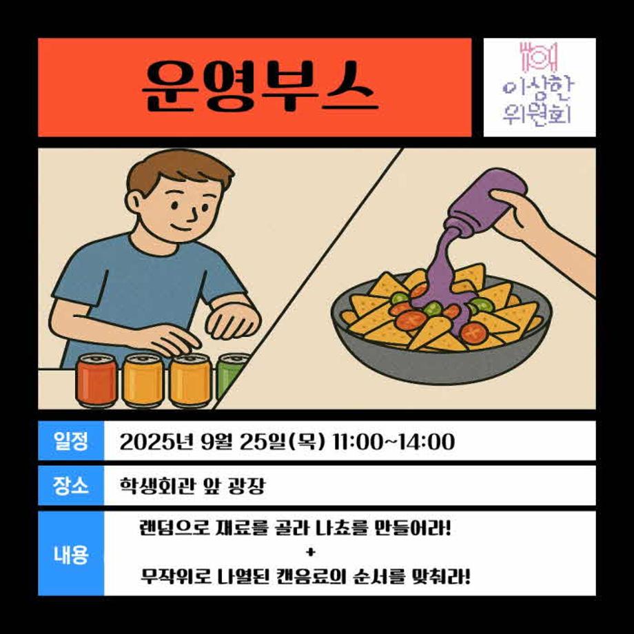 본문 시작 홈으로 공지사항 학생위원회 개요 학생위원회 소개 공지사항 활동결과 홈페이지가이드 프로그램 계획 프로그램 계획 세명대학교 공지사항 프로그램 계획 페이스북 트위터 프린트 [이상한 위원회] 유쾌하거나 불쾌하거나 학생처 524 2025-09-25 안녕하세요 🍽 이상한 위원회 🍽 입니다 청룡체전 기간 중 이상한 위원회에서 나쵸 만들기와 캔 위치 맞히기 게임을 진행하는 홍보 부스를 운영합니다! 🍭 이상한 위원회 인스타도 팔로우 하고 재미있는 경험하고 가세요🤗 ✅ 선착순 150명 ✅ 일시: 2025. 9. 25.(목) ✅ 시간: 11시~14시 ✅ 장소: 학생회관 앞 광장 많은 참여와 관심 부탁드립니다❤ 목록 이전[용감한 창업자] 어떤 향이 좋아? 이전[밀어주는 위원회] 너의 꿈, 우리가 밀어줄게! 담당부서 : 장학복지팀 담당자 : - 연락처 : 043-649-1142 최종수정일 : 2024-10-26 만족도조사 만족도 조사 이 페이지에서 제공하는 정보에 대하여 만족하시나요? 매우만족 만족 보통 불만족 매우불만족