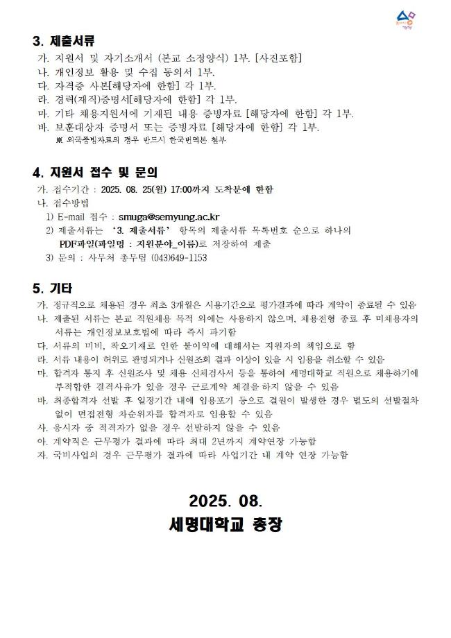 본문 시작 홈으로 커뮤니티 학과소개 교수소개 교육과정 커뮤니티 입학 정보 홈페이지가이드 취업/실습정보 학과공지 취업/실습정보 포토갤러리 취업/실습정보 페이스북 트위터 프린트 세명대학교 직원 채용 공고 [2025년 08월 25일 마감] 전기전자공학과 455 2025-08-14 목록 이전[(주)성풍건설] 채용 공고 다음 [알쓸신잡_2025년 8월 3주차] ●취업 및 일자리 정보 제공 안내문● 만족도조사 만족도 조사 이 페이지에서 제공하는 정보에 대하여 만족하시나요? 매우만족 만족 보통 불만족 매우불만족