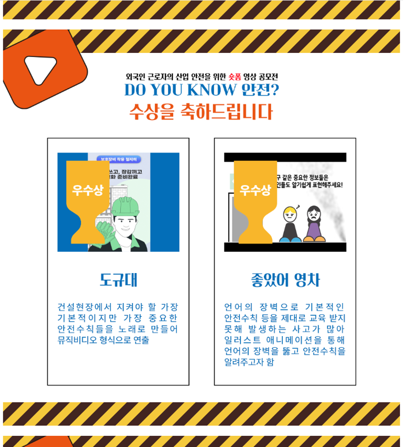 본문 시작 홈으로 학과자랑 학과소개 학과과정 시영소식 입학/취업 AI 학과자랑 SNS소통 홈페이지가이드 학과자랑 학과자랑 갤러리 공모전 동아리 졸업전시회 학과자랑 페이스북 트위터 프린트 외국인 근로자를 위한 숏폼 영상 공모전 - DO YOU KNOW 안전? 시각영상디자인학과 1809 2024-09-08 2학년 심*호/방*림팀(좋았어 영차)이 우수상을 수상하엿습니다~ 축하합니다~ 외국인 근로자의 산업안전을 위한 숏폼 영상 공모전 (safetycon.kr) [본선진출후보작] 꼭 알아둬요! 산업 안전 수칙! (youtube.com) 목록 이전2024학년도 1학기 총장표창 (시각영상디자인학과 3명 수상) 다음 졸업생 인터뷰 - 20학번 졸업생 이*현 담당부서 : 시각영상디자인학과 담당자 : - 연락처 : 043-649-1726 최종수정일 : 2024-10-26 만족도조사 만족도 조사 이 페이지에서 제공하는 정보에 대하여 만족하시나요? 매우만족 만족 보통 불만족 매우불만족
