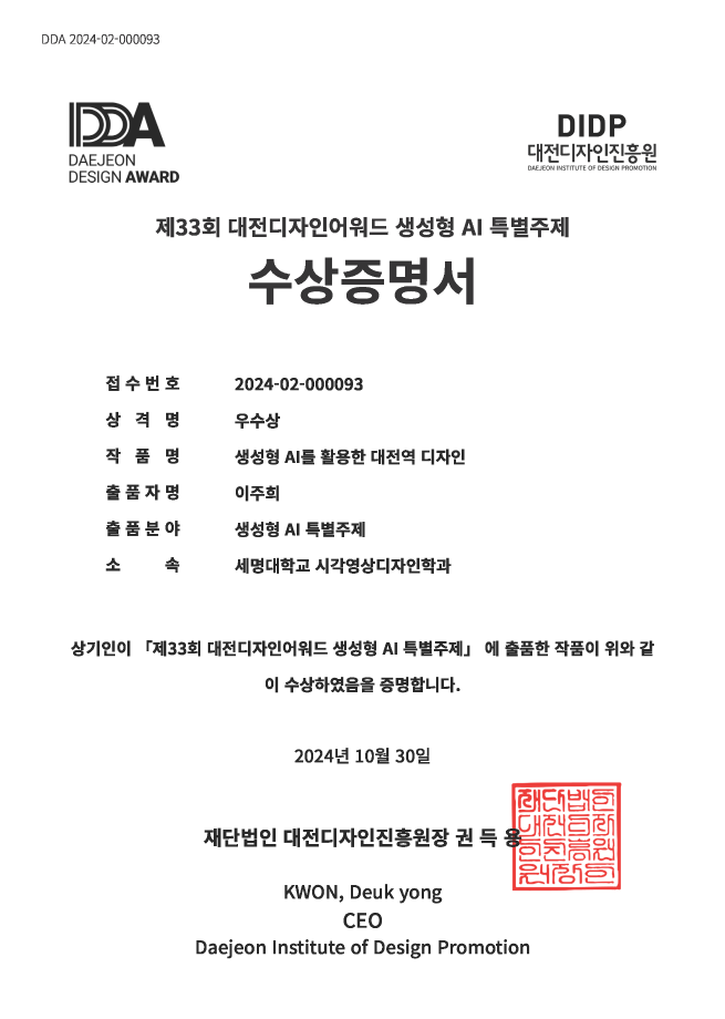 본문 시작 홈으로 학과자랑 학과소개 학과과정 시영소식 입학/취업 AI 학과자랑 SNS소통 홈페이지가이드 학과자랑 학과자랑 갤러리 공모전 동아리 졸업전시회 학과자랑 페이스북 트위터 프린트 제33회 대전디자인어워드-우수상 시각영상디자인학과 1665 2024-11-02 제33회 대전디자인어워드의 생성형 AI 특별주제부분에서 우수상(생성형 AI를 활용한 대전역 디자인-이*희학생)을 수상하였습니다 이밖에 고*호, 윤*환, 조*니학생이 특선 수상하엿습니다 목록 이전졸업생 인터뷰 - 20학번 졸업생 이*현 다음 시장 서비스러닝 / 벽화 서비스러닝 담당부서 : 시각영상디자인학과 담당자 : - 연락처 : 043-649-1726 최종수정일 : 2024-10-26 만족도조사 만족도 조사 이 페이지에서 제공하는 정보에 대하여 만족하시나요? 매우만족 만족 보통 불만족 매우불만족